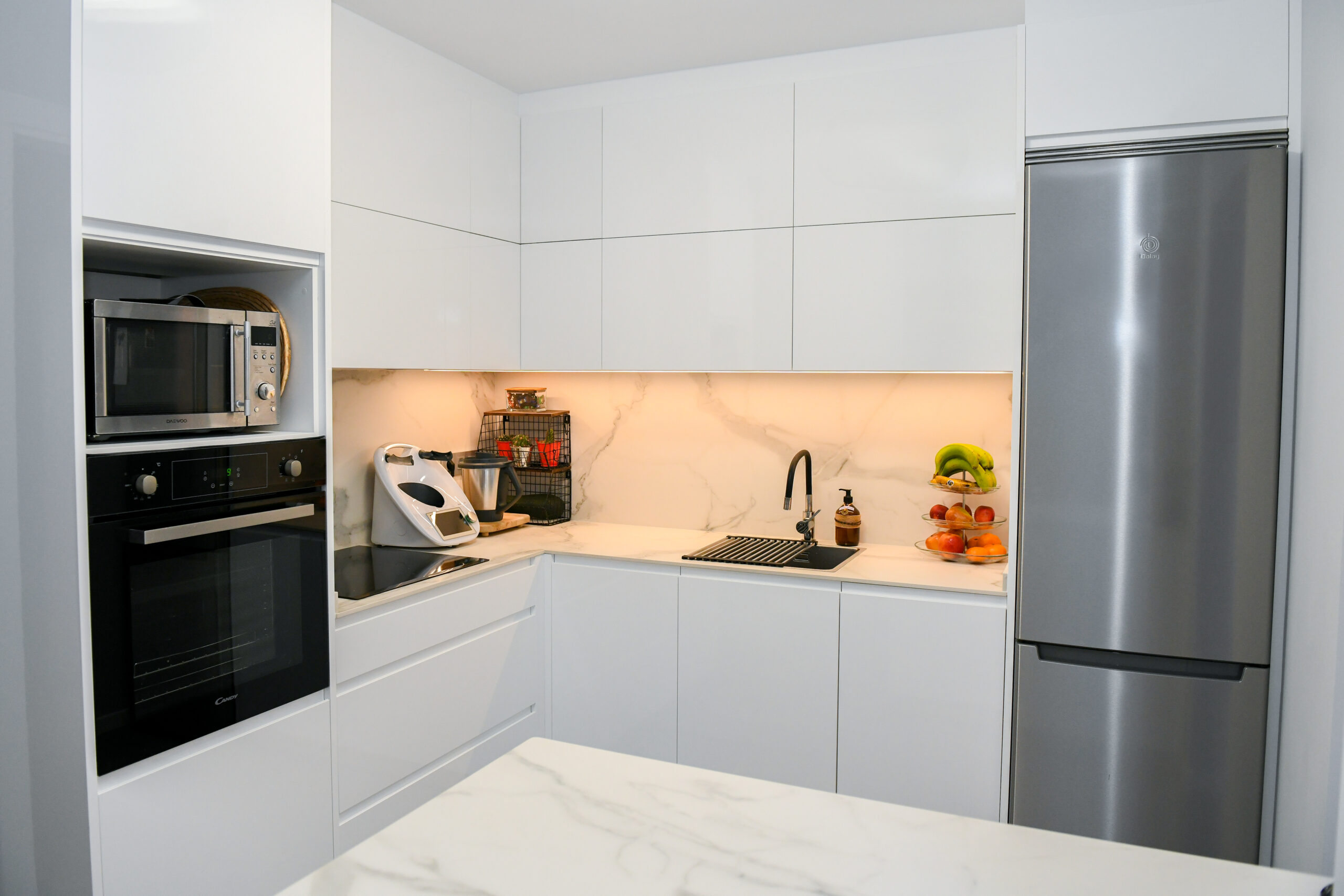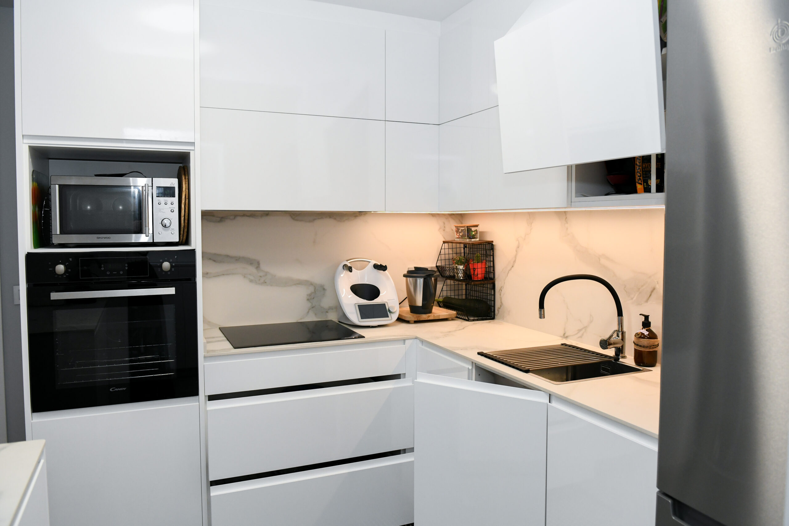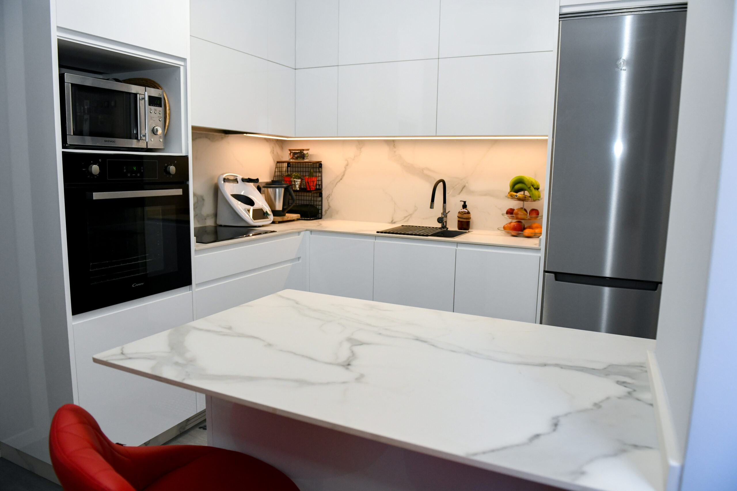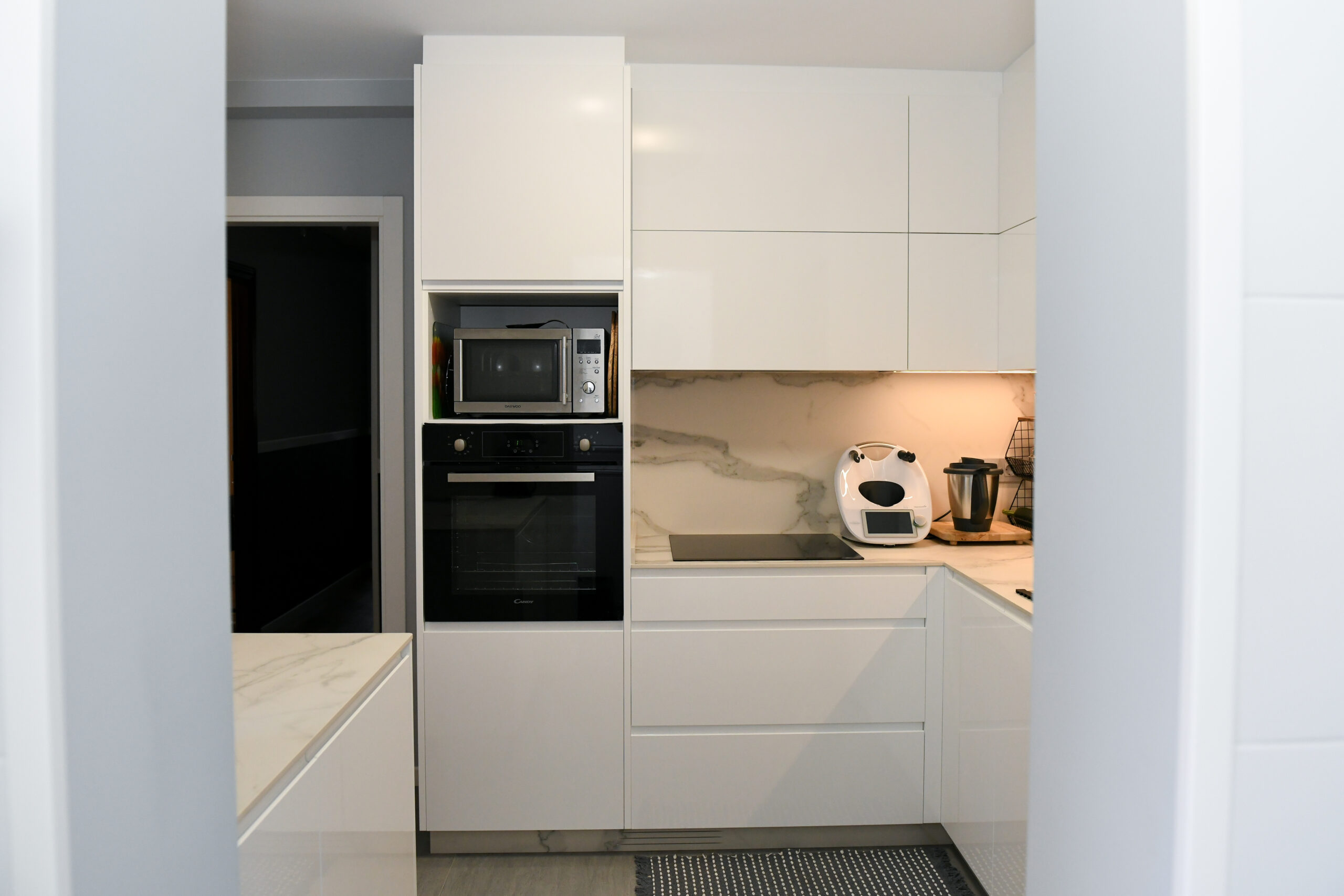 En esta cocina priorizamos aprovechar al máximo todos los espacios, apostando por el blanco brillo para inundar de luminosidad la estancia con detalles como el veteado de la encimera para hacer un espacio único.