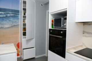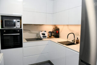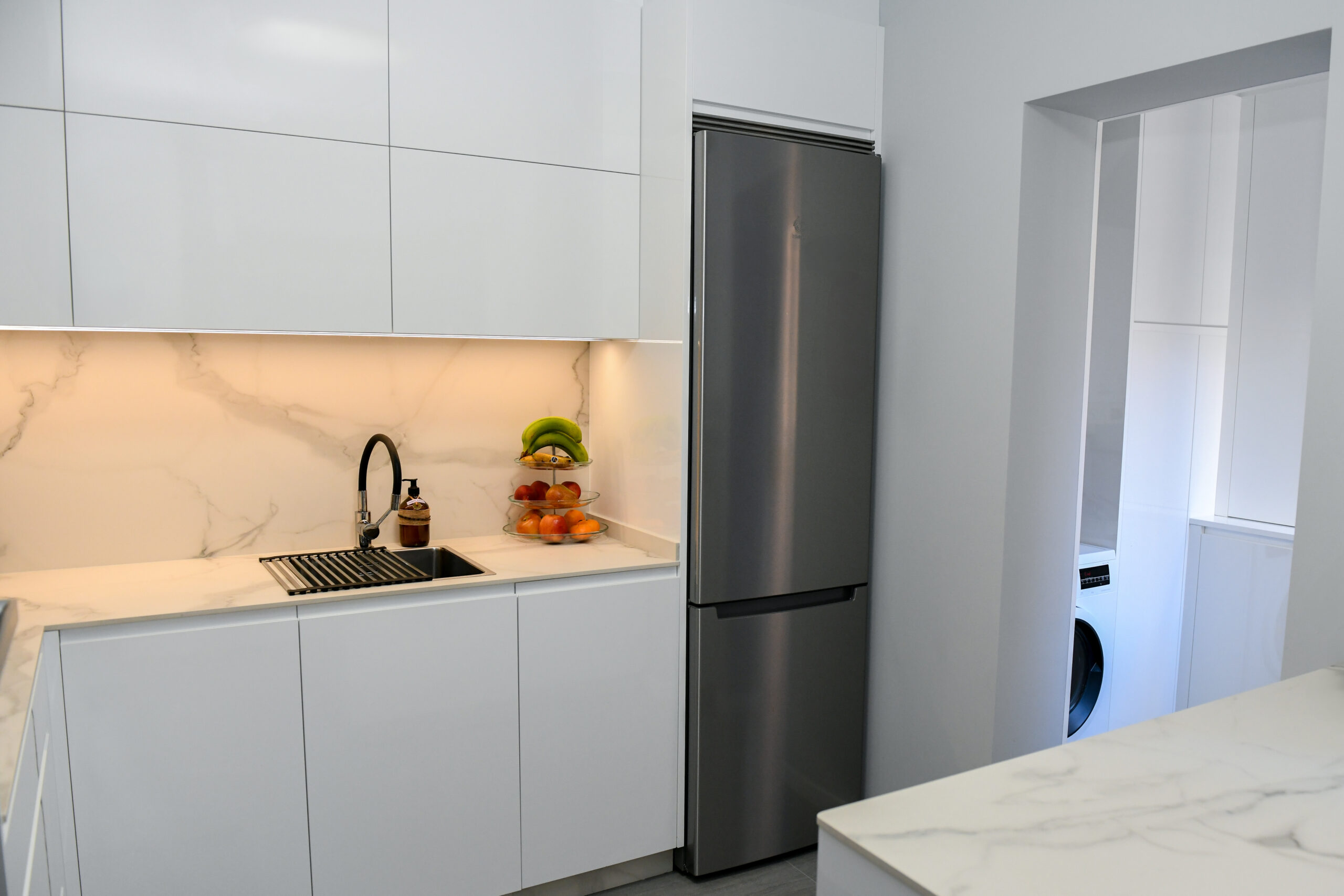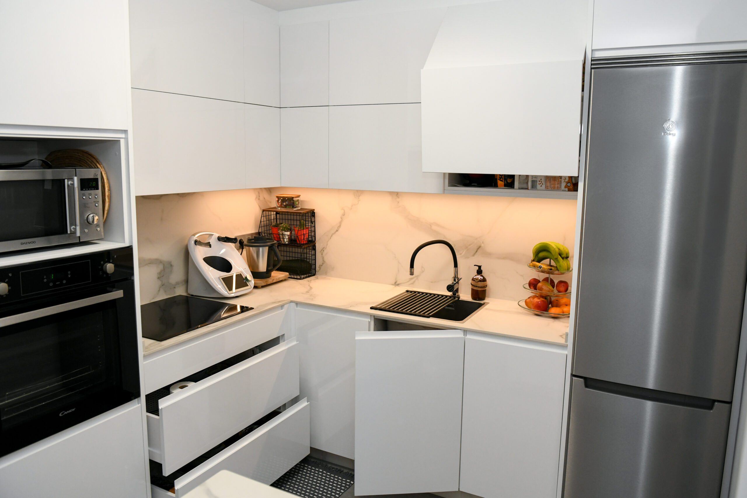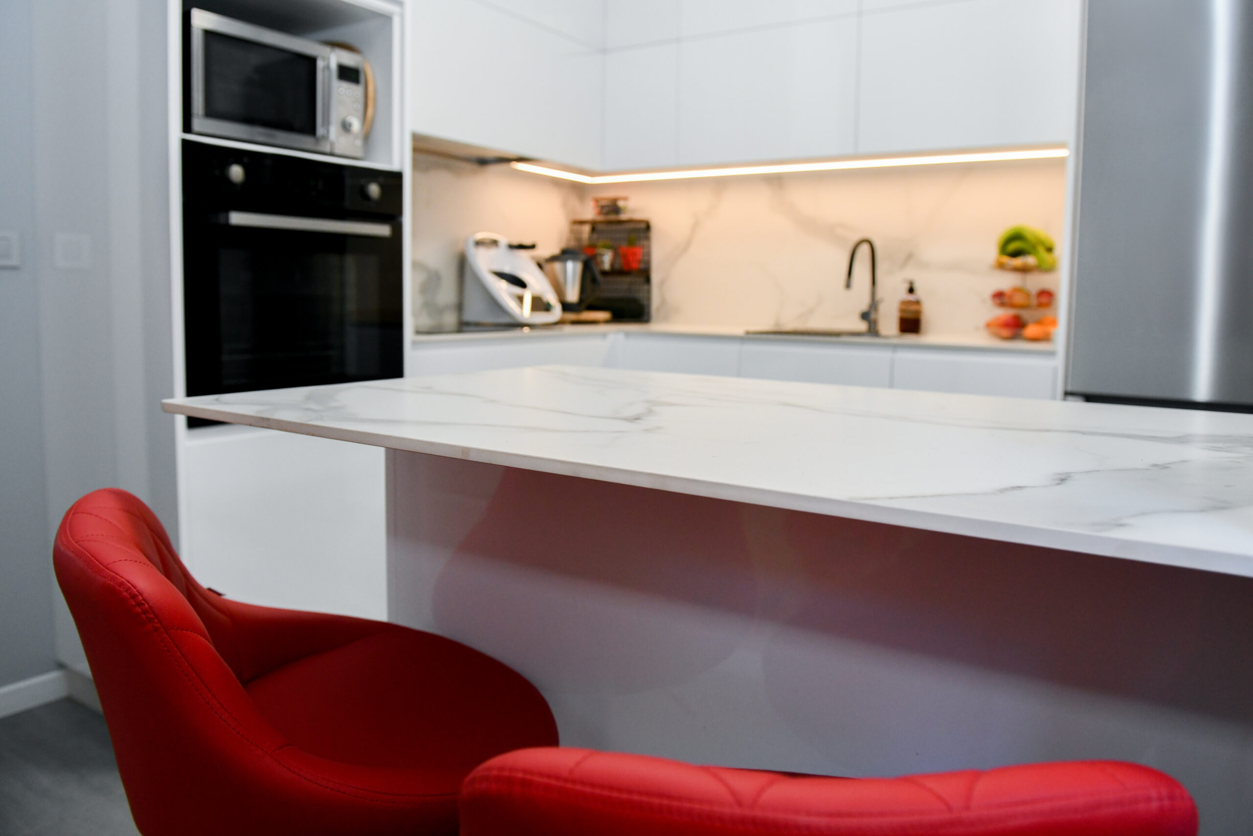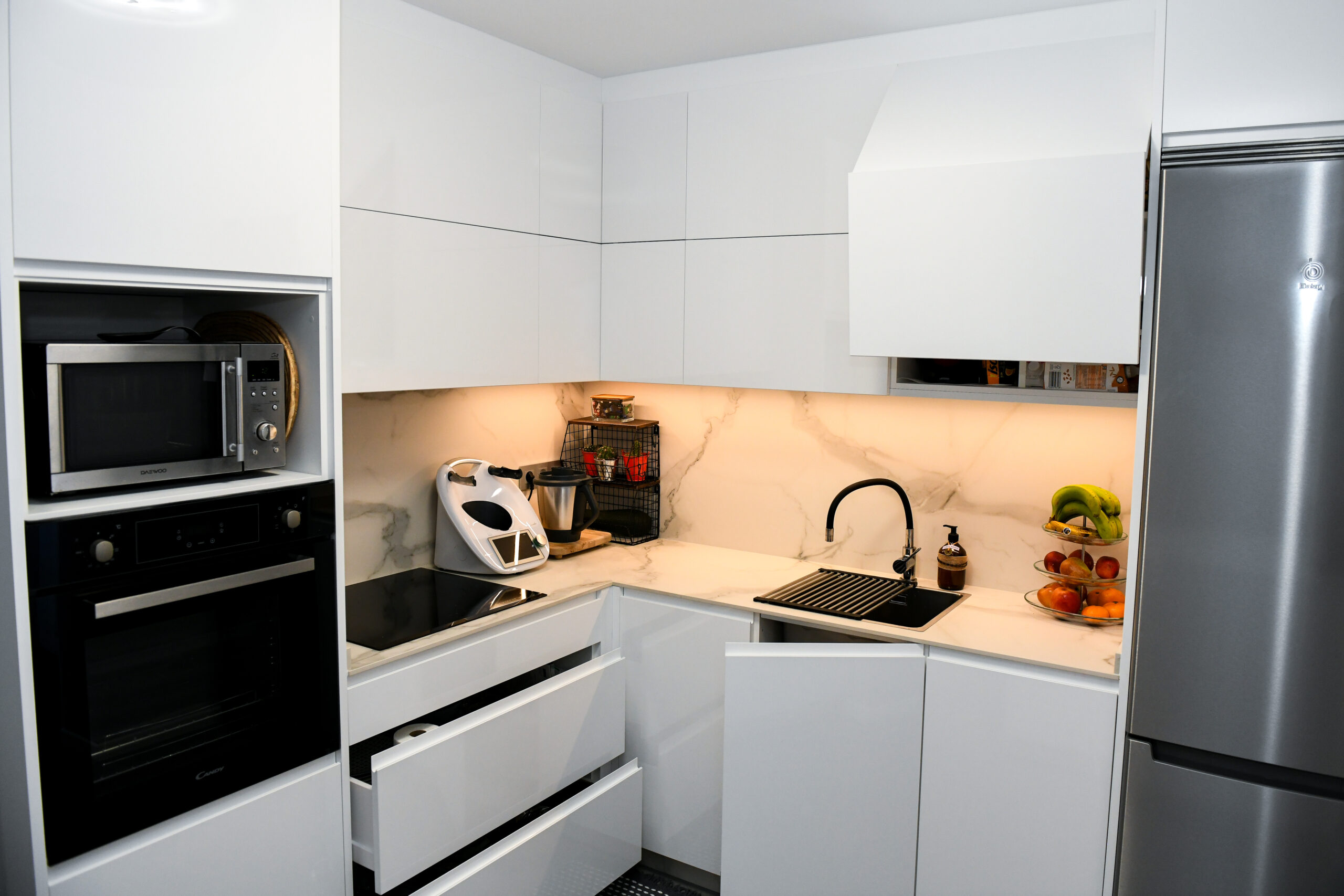 En esta cocina priorizamos aprovechar al máximo todos los espacios, apostando por el blanco brillo para inundar de luminosidad la estancia con detalles como el veteado de la encimera para hacer un espacio único.