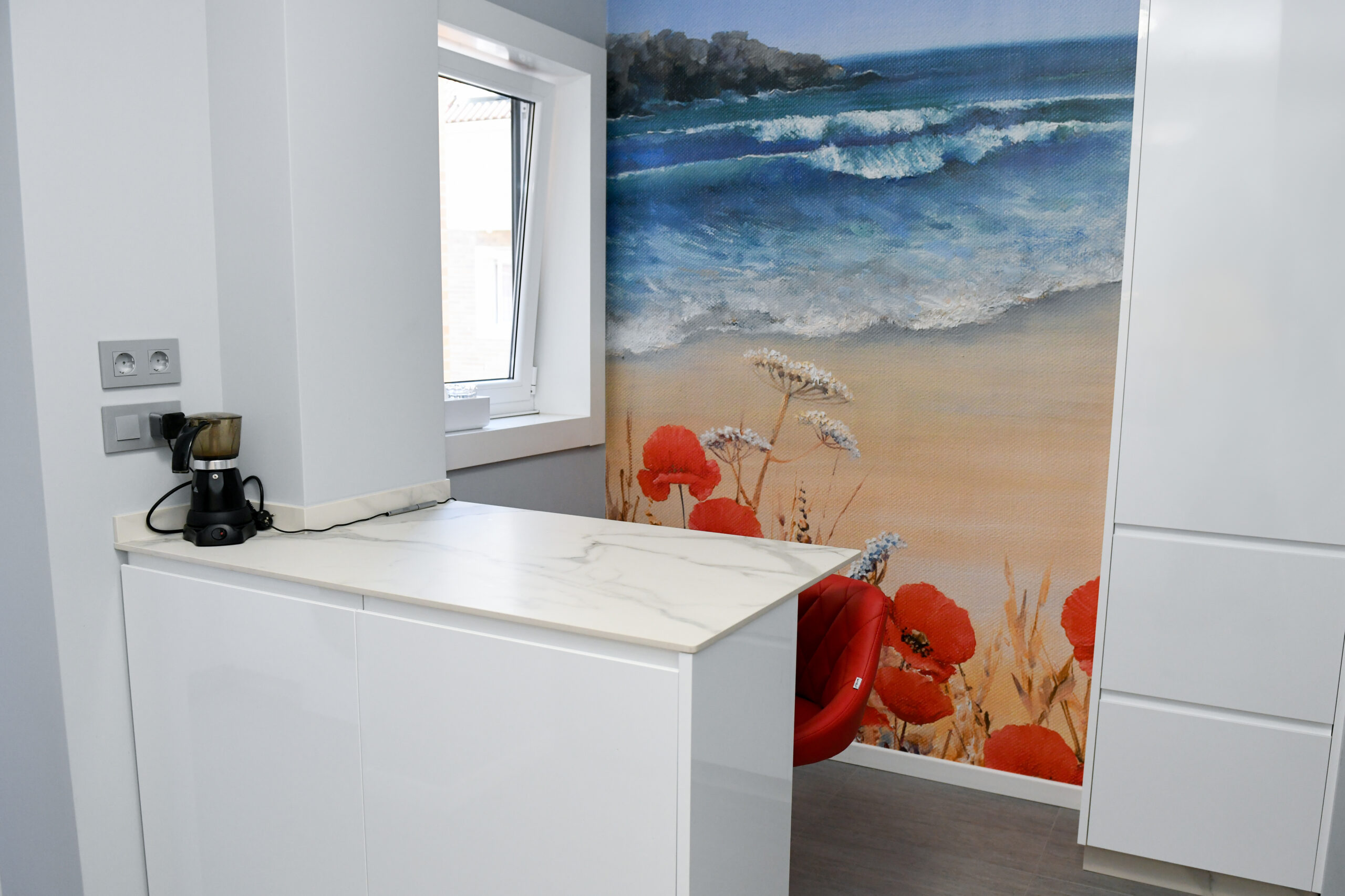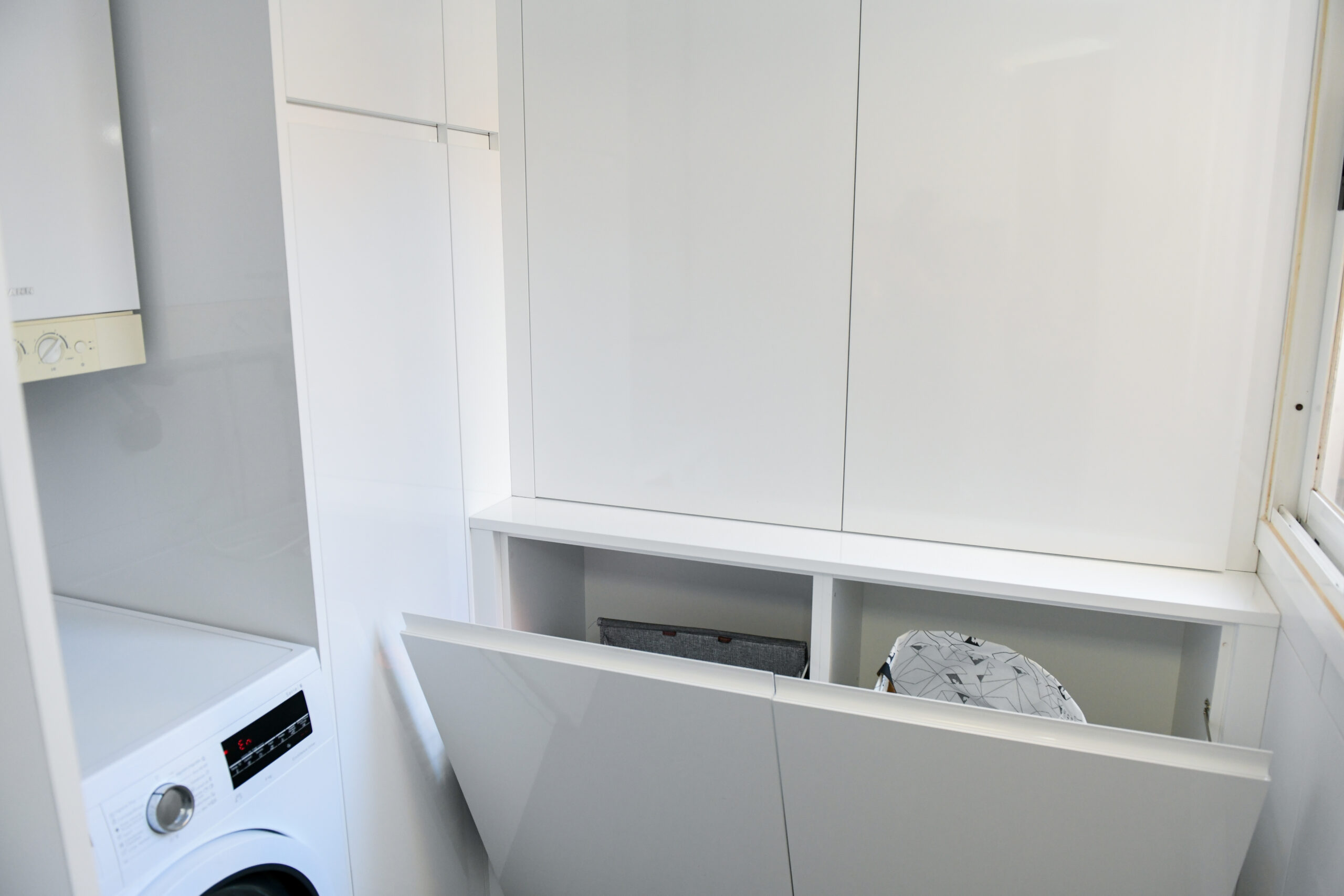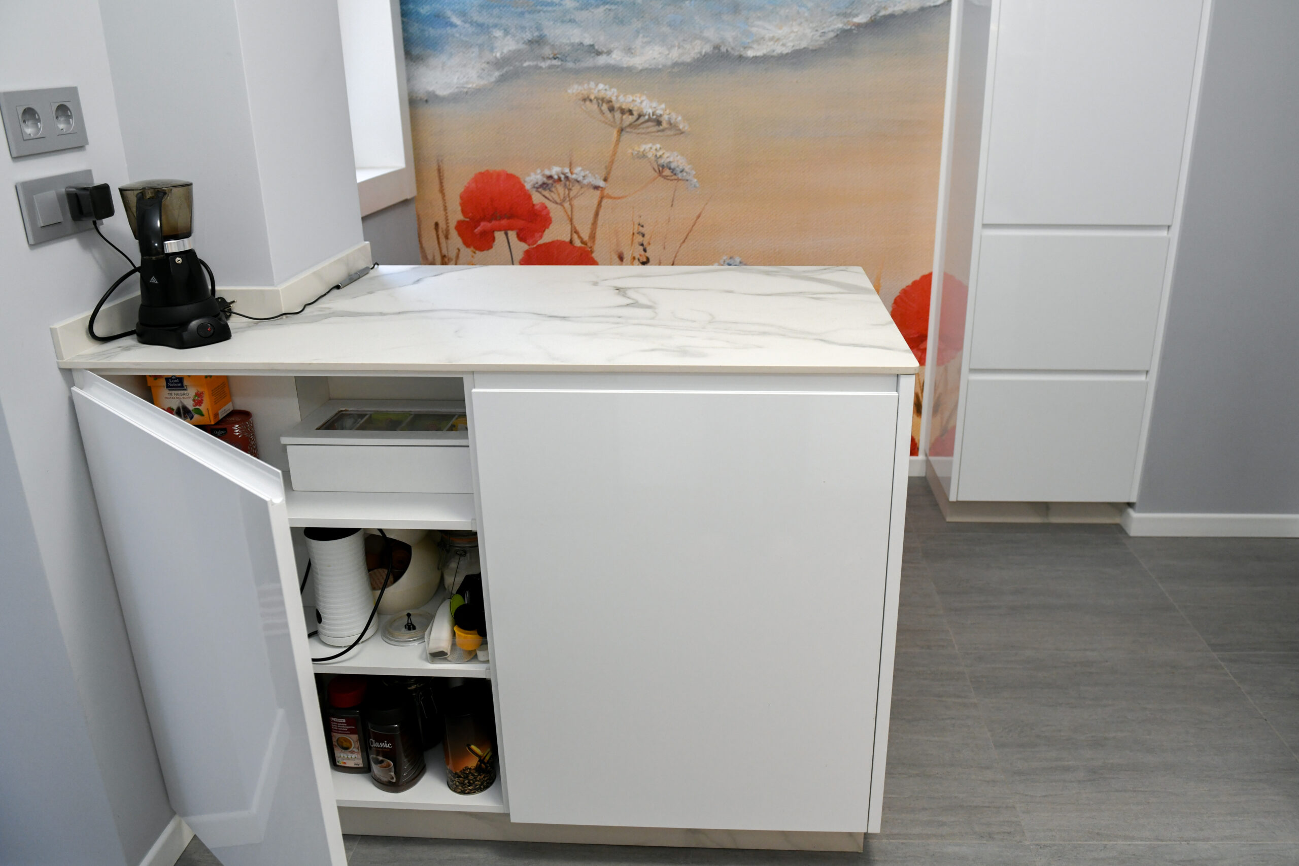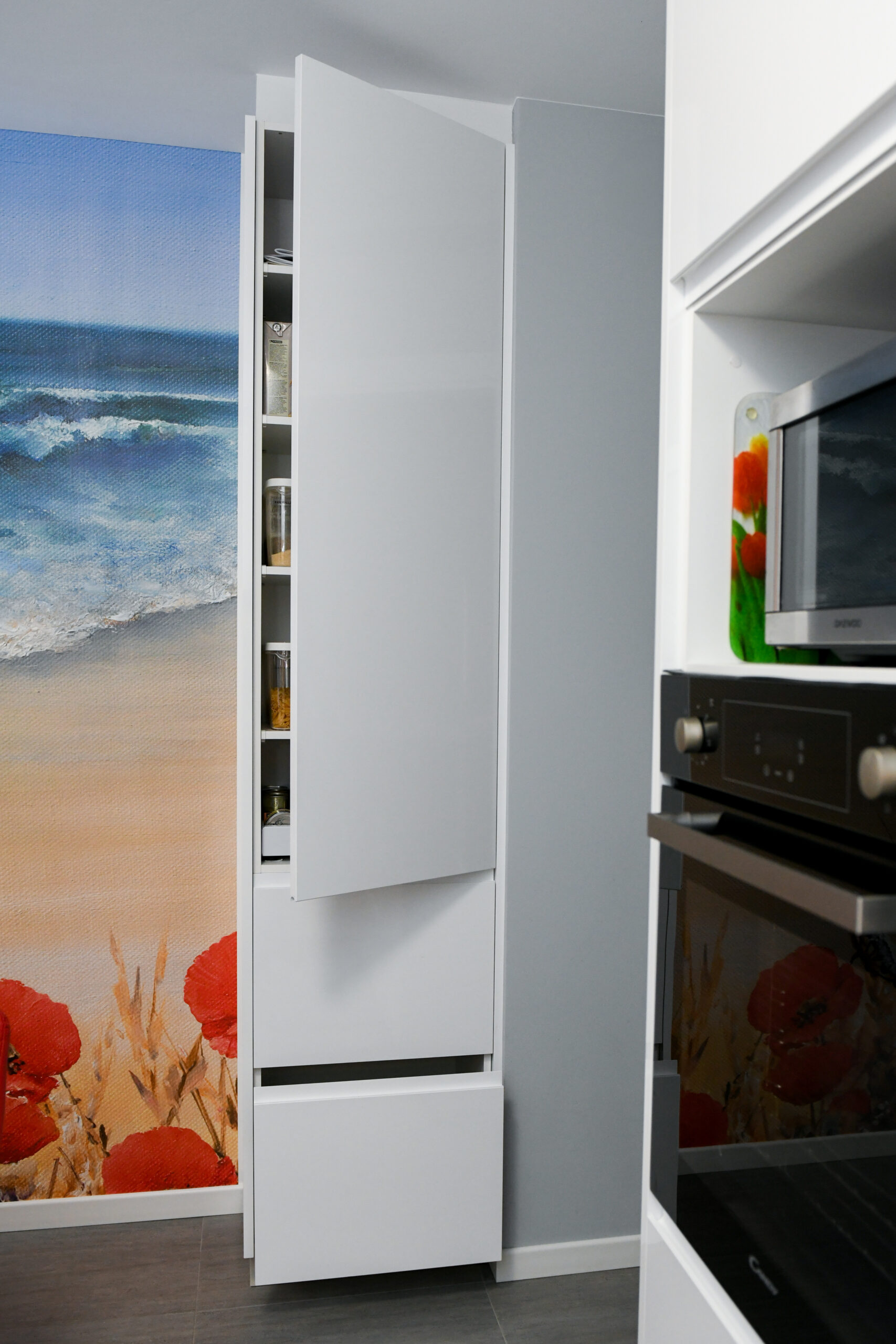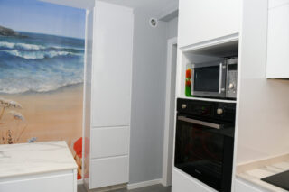 En esta cocina priorizamos aprovechar al máximo todos los espacios, apostando por el blanco brillo para inundar de luminosidad la estancia con detalles como el veteado de la encimera para hacer un espacio único.