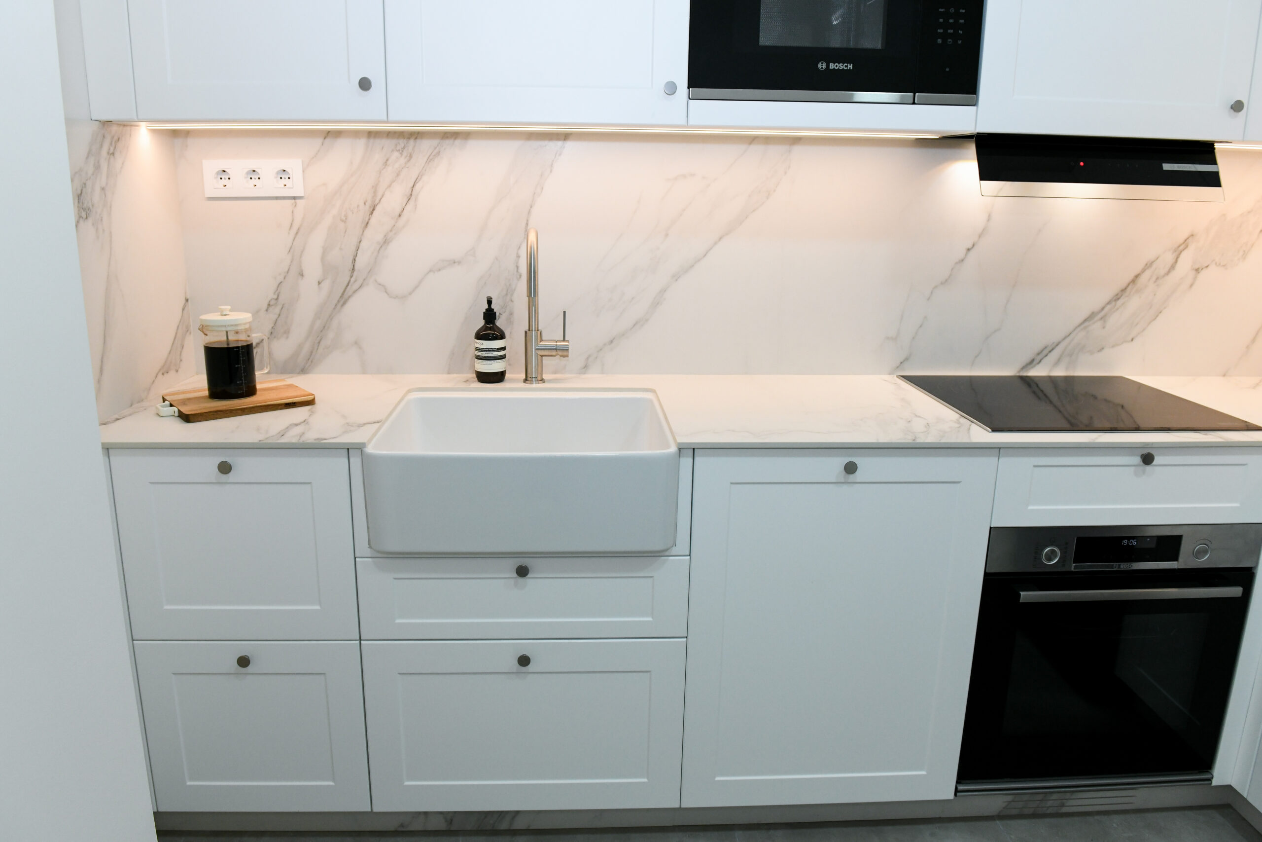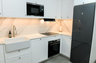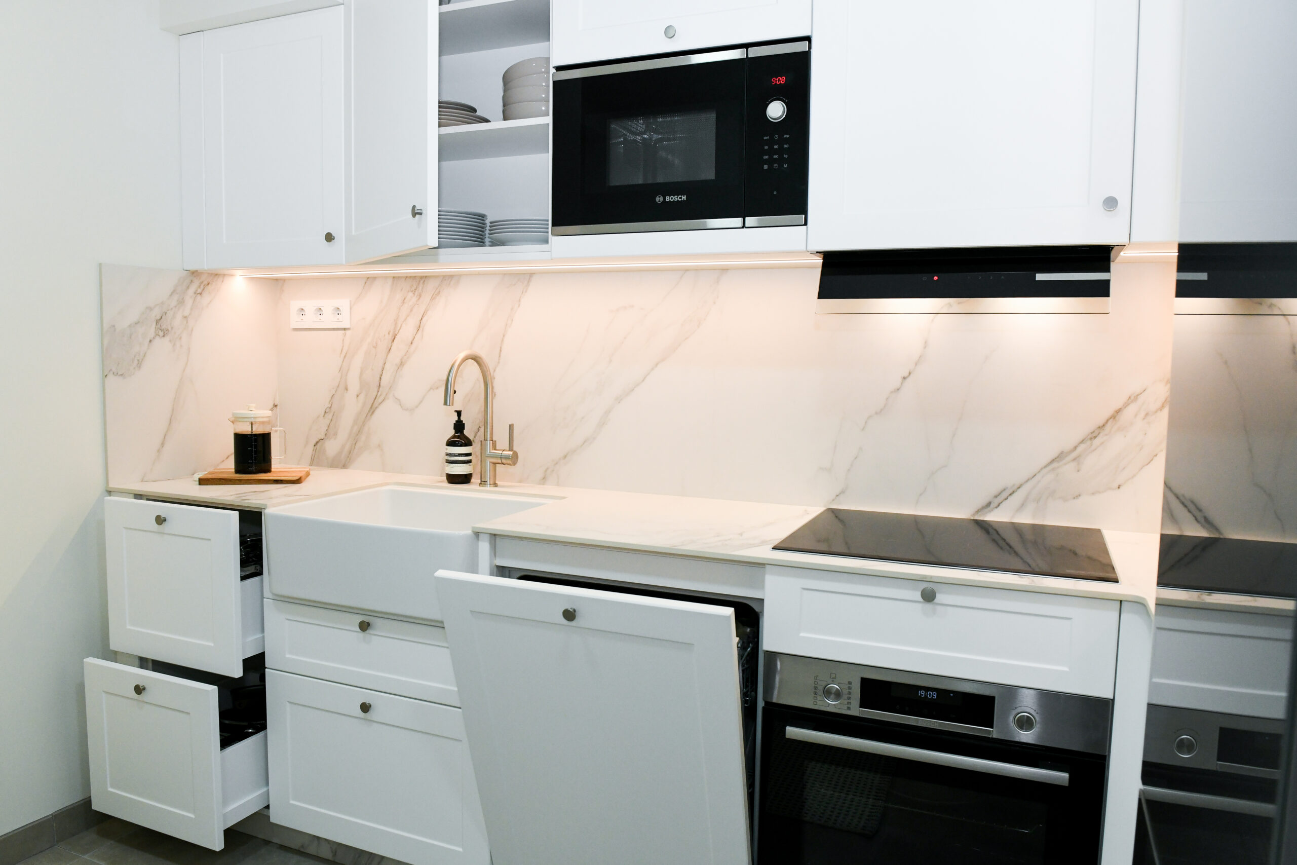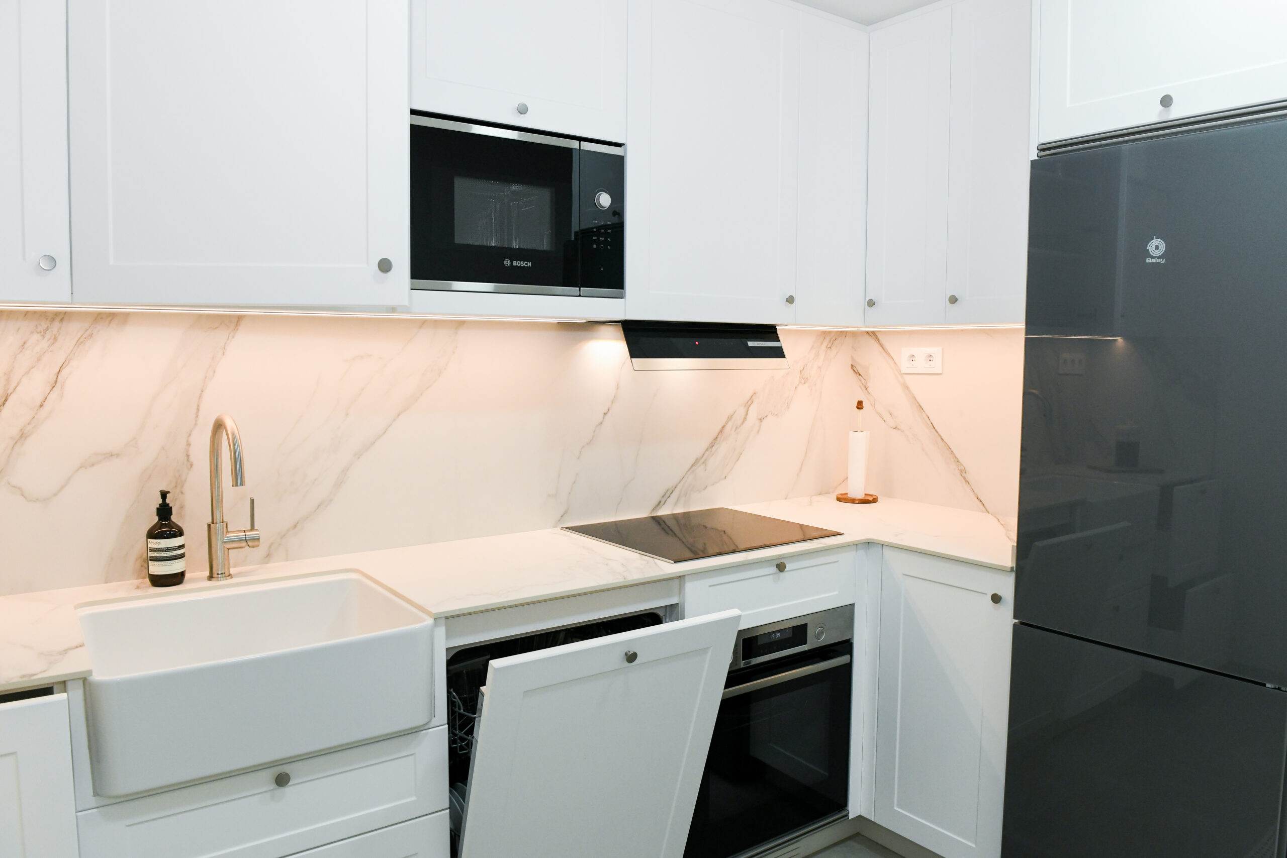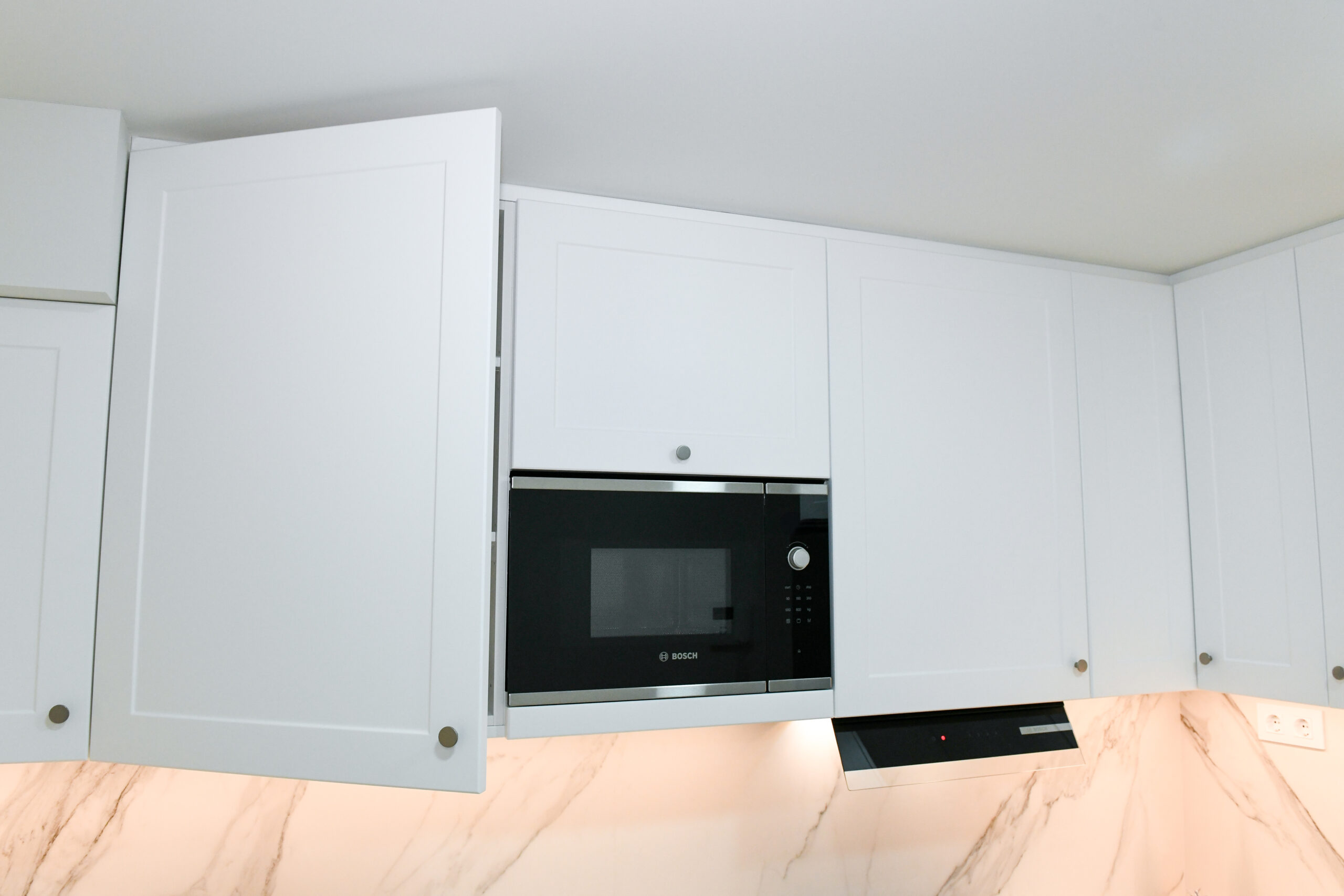 Instalación de cocina en L con puertas enmarcadas, evocando el estilo mas tradicional en un luminoso color blanco.