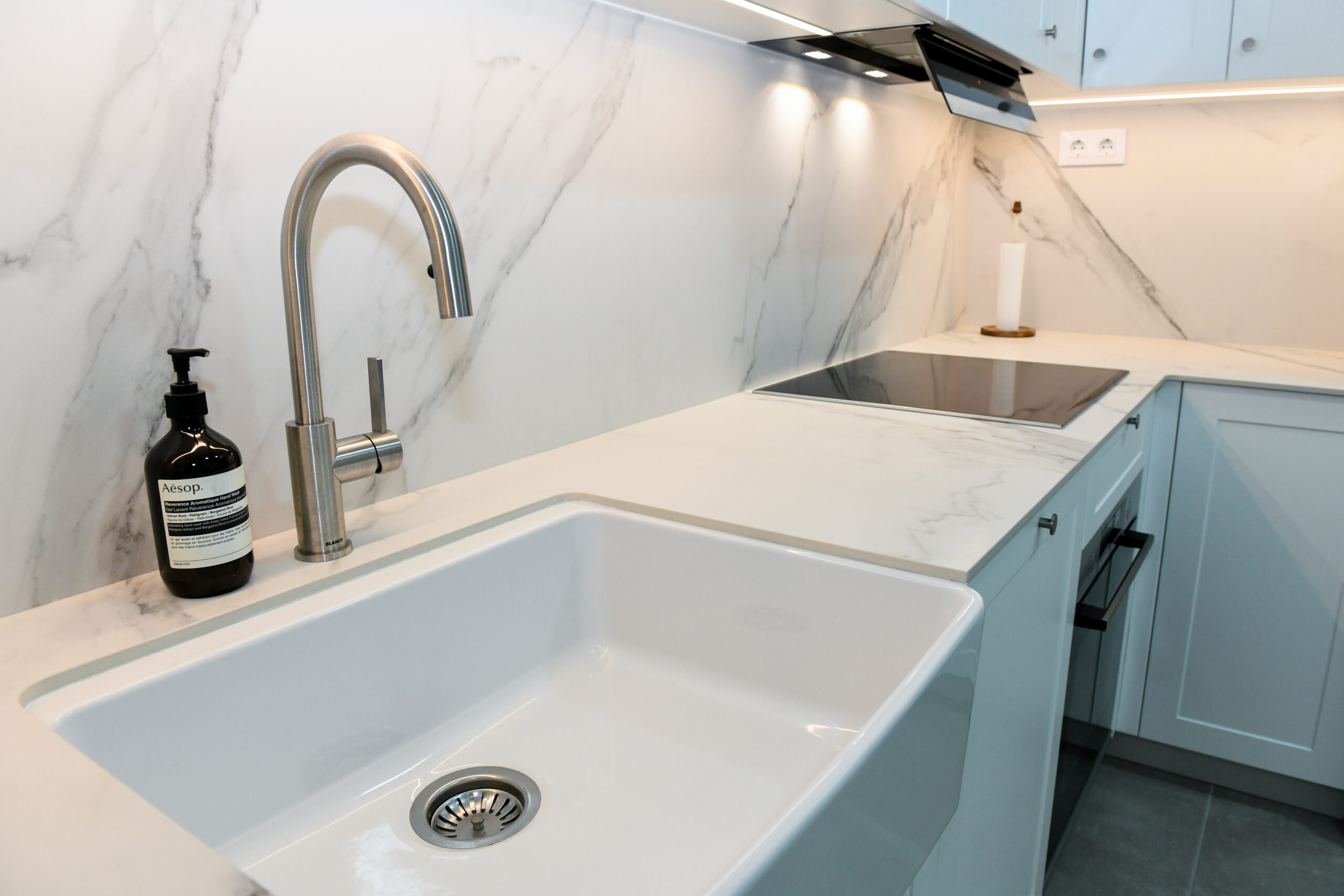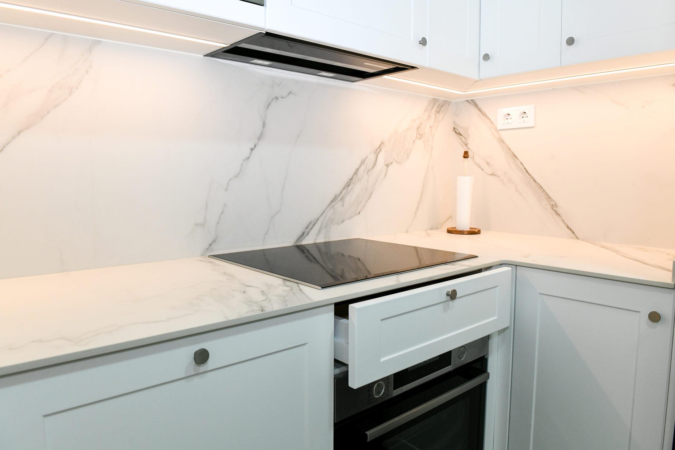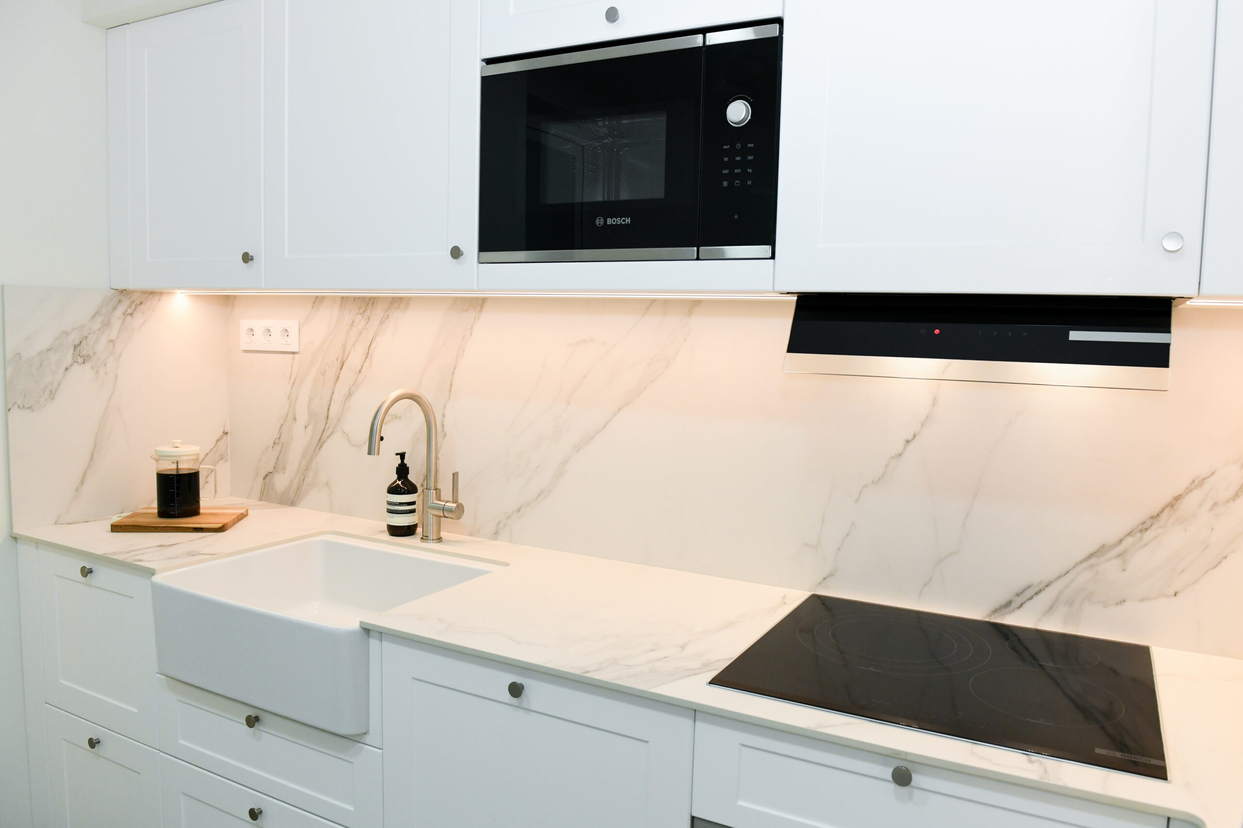 Encimera, trasera y zócalo de porcelánico Coverlam Statuario Extra en 1,2cm, caracterizado por su fondo blanco puro con etas grises y gruesas.