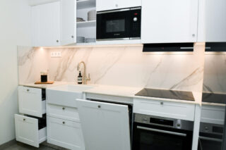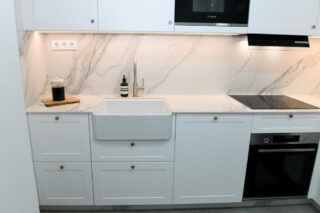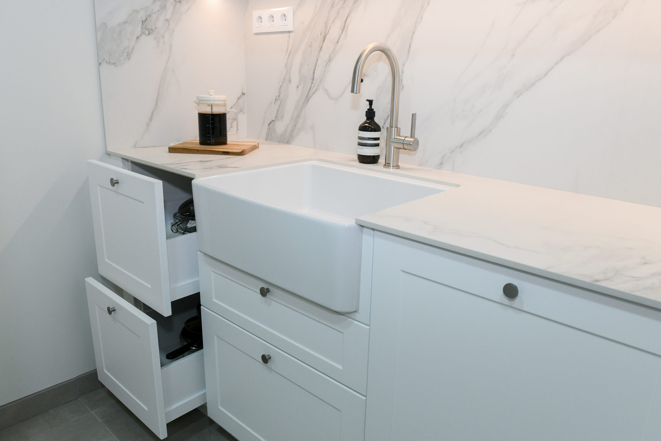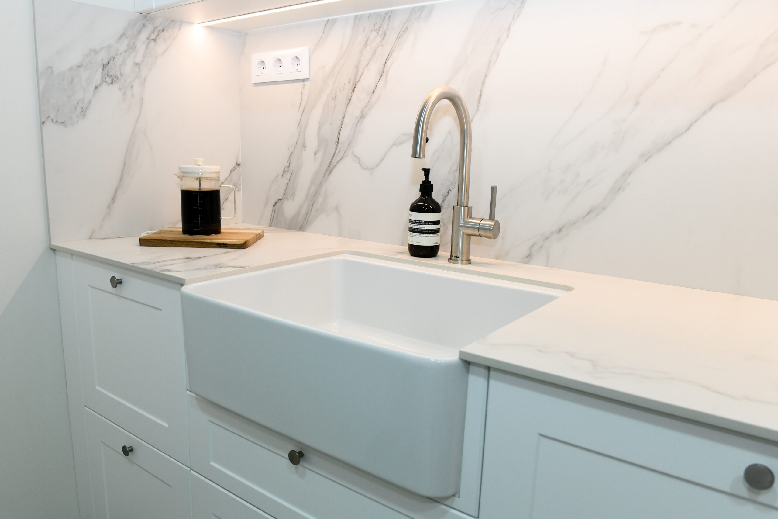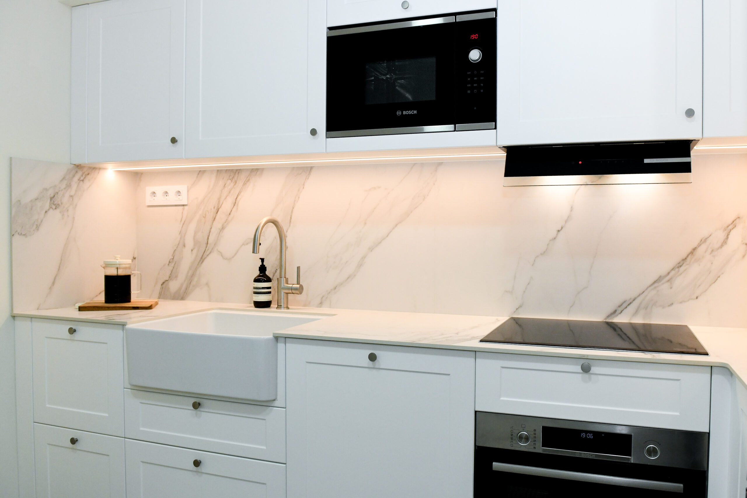 Encimera, trasera y zócalo de porcelánico Coverlam Statuario Extra en 1,2cm, caracterizado por su fondo blanco puro con etas grises y gruesas.