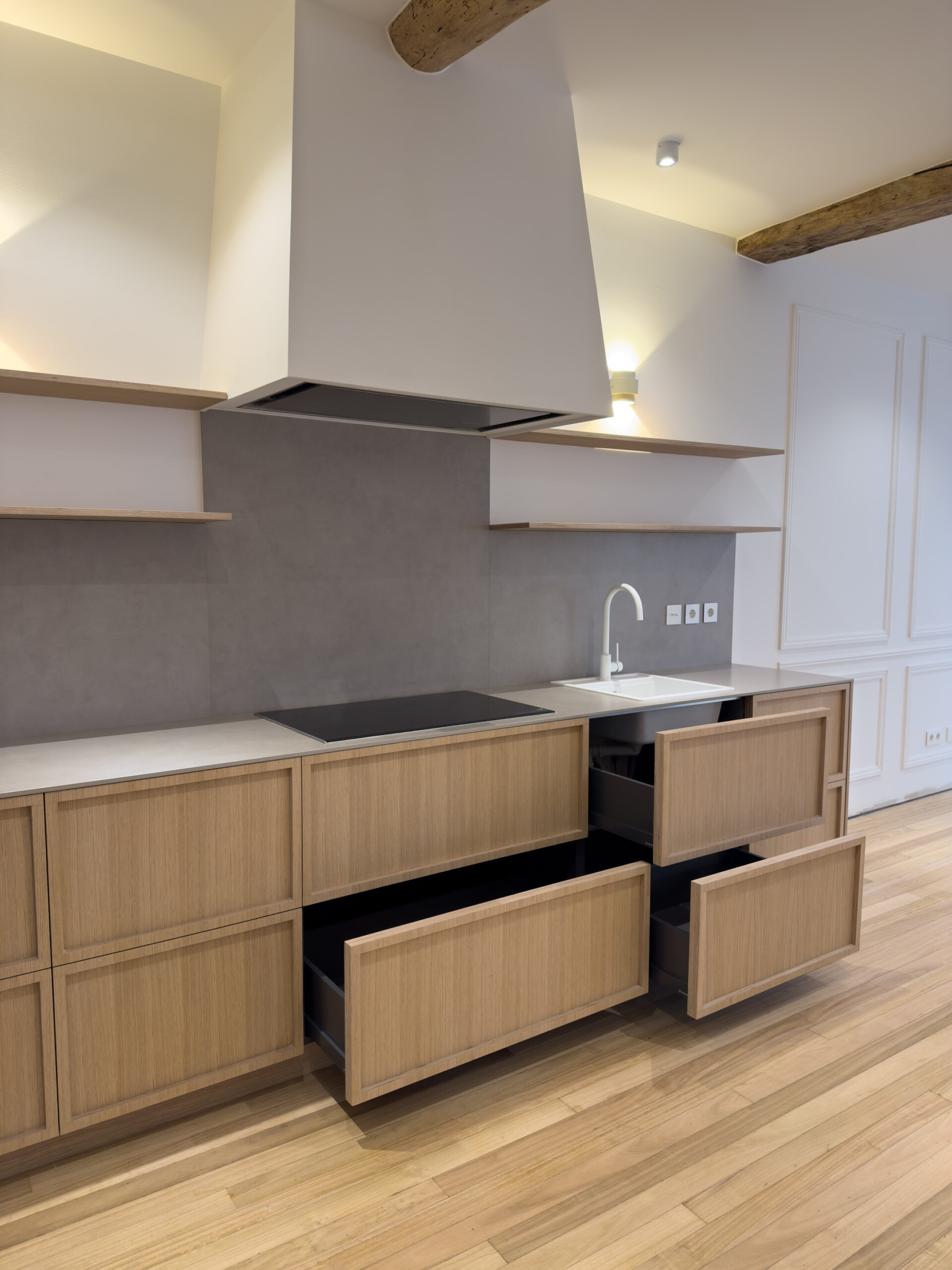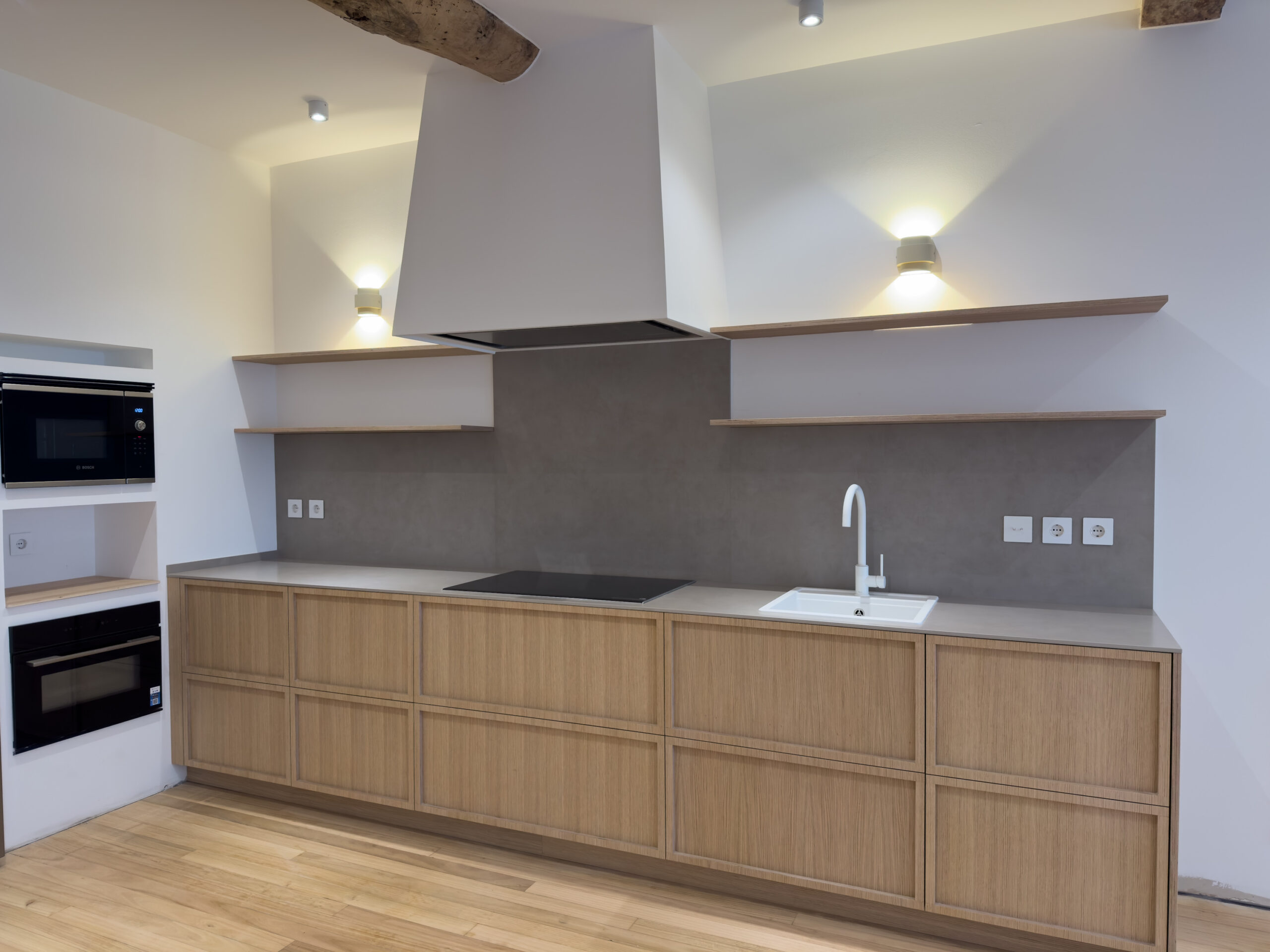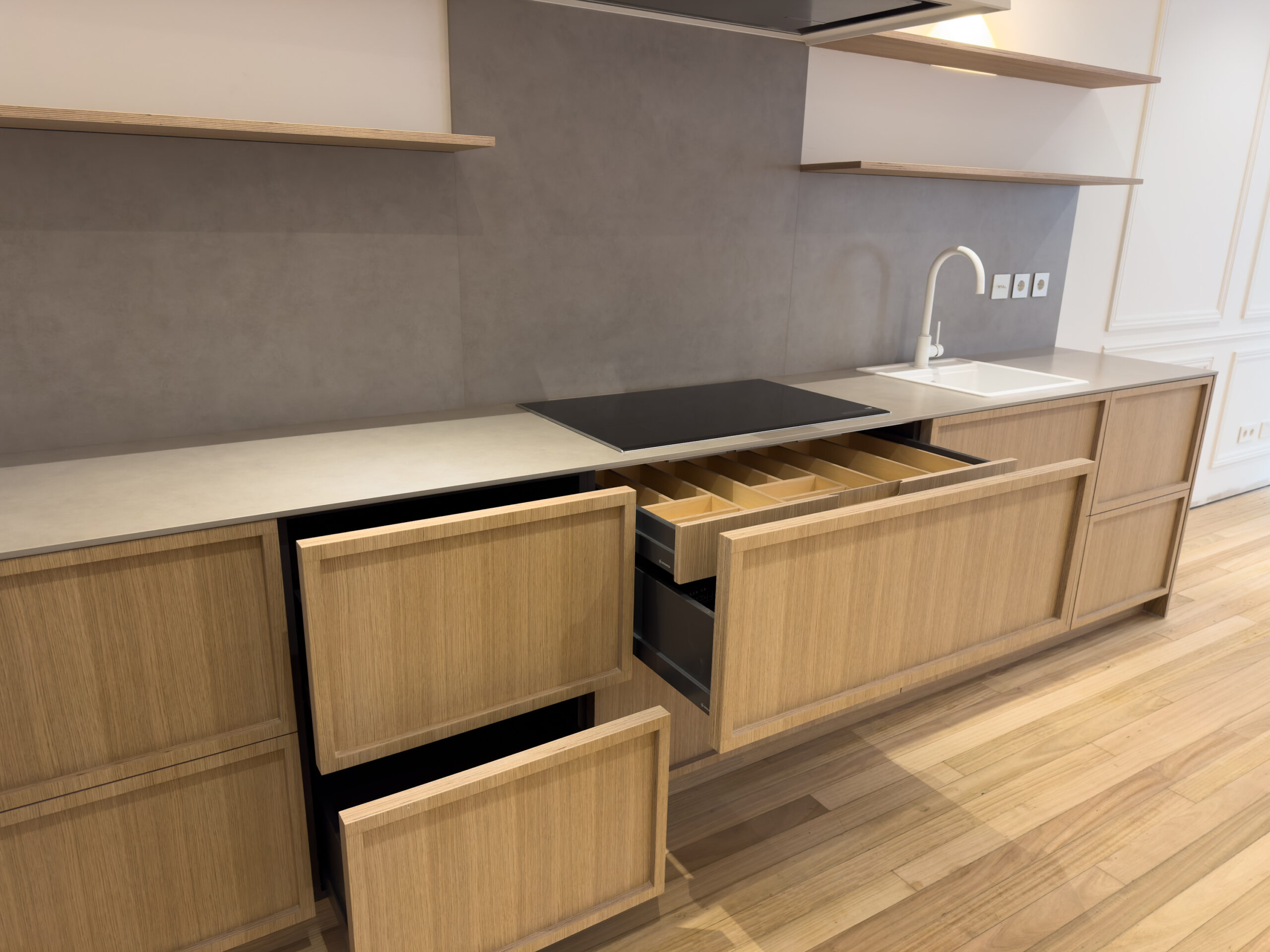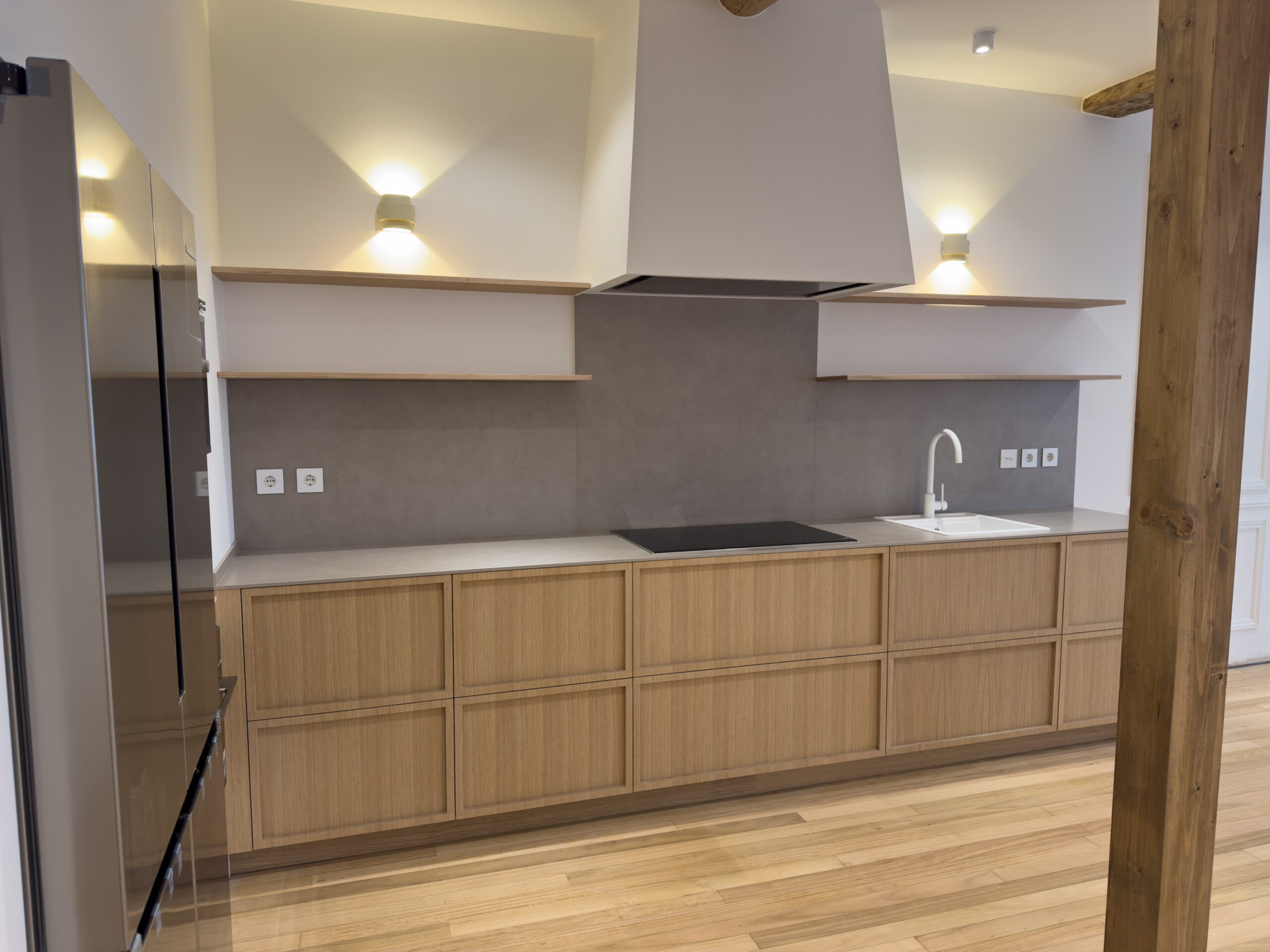 Instalación de cocina recta, con puertas en tablero marino color roble con tirador integrado en la propia puerta.