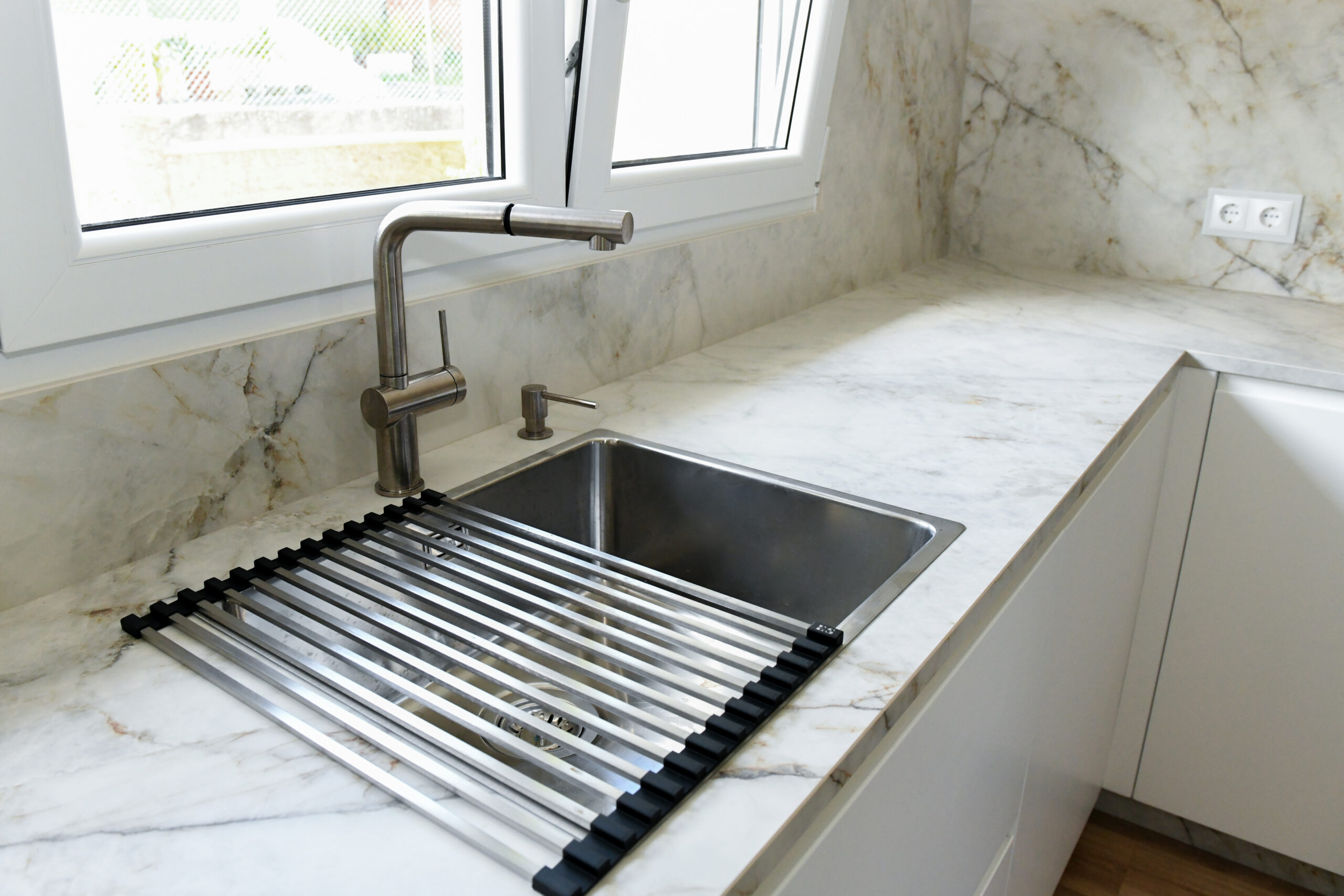 Fregadero de acero inoxidable instalado sobre encimera con escurridor y grifo extraíble con caño recto.