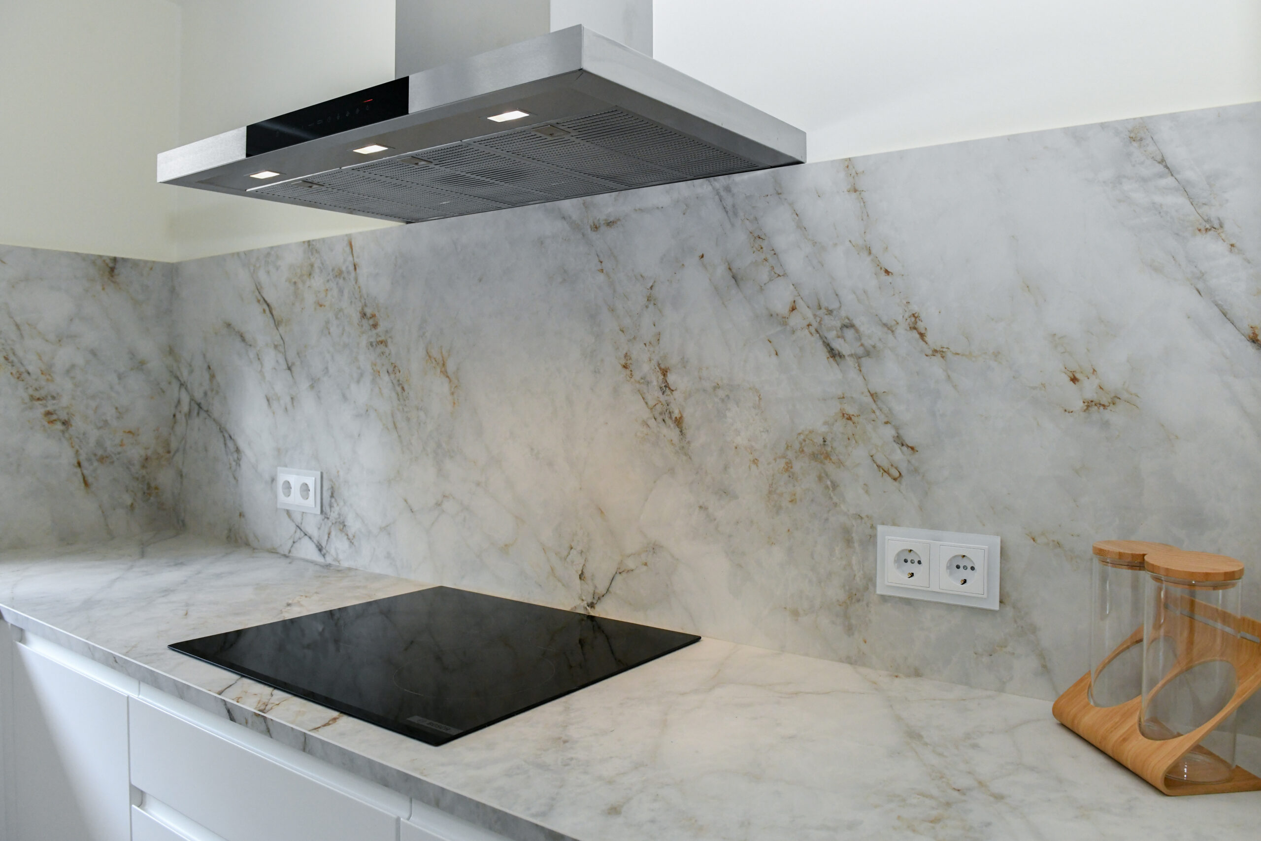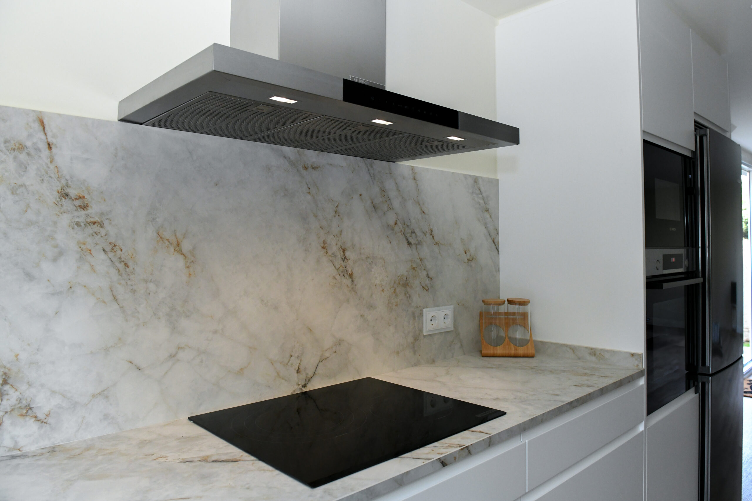 Encimera y trasera en porcelánico Coverlam Cuarzo Reno con espesor de 2,5cm, caracterizada por su imitación al mármol blanco alterado por matices en tonos cálidos.