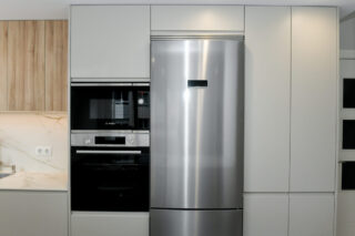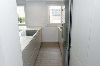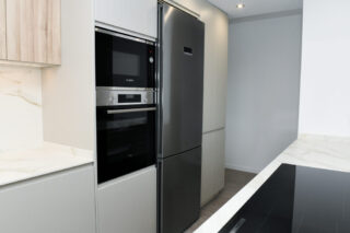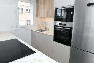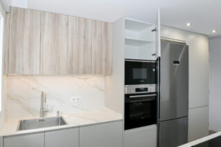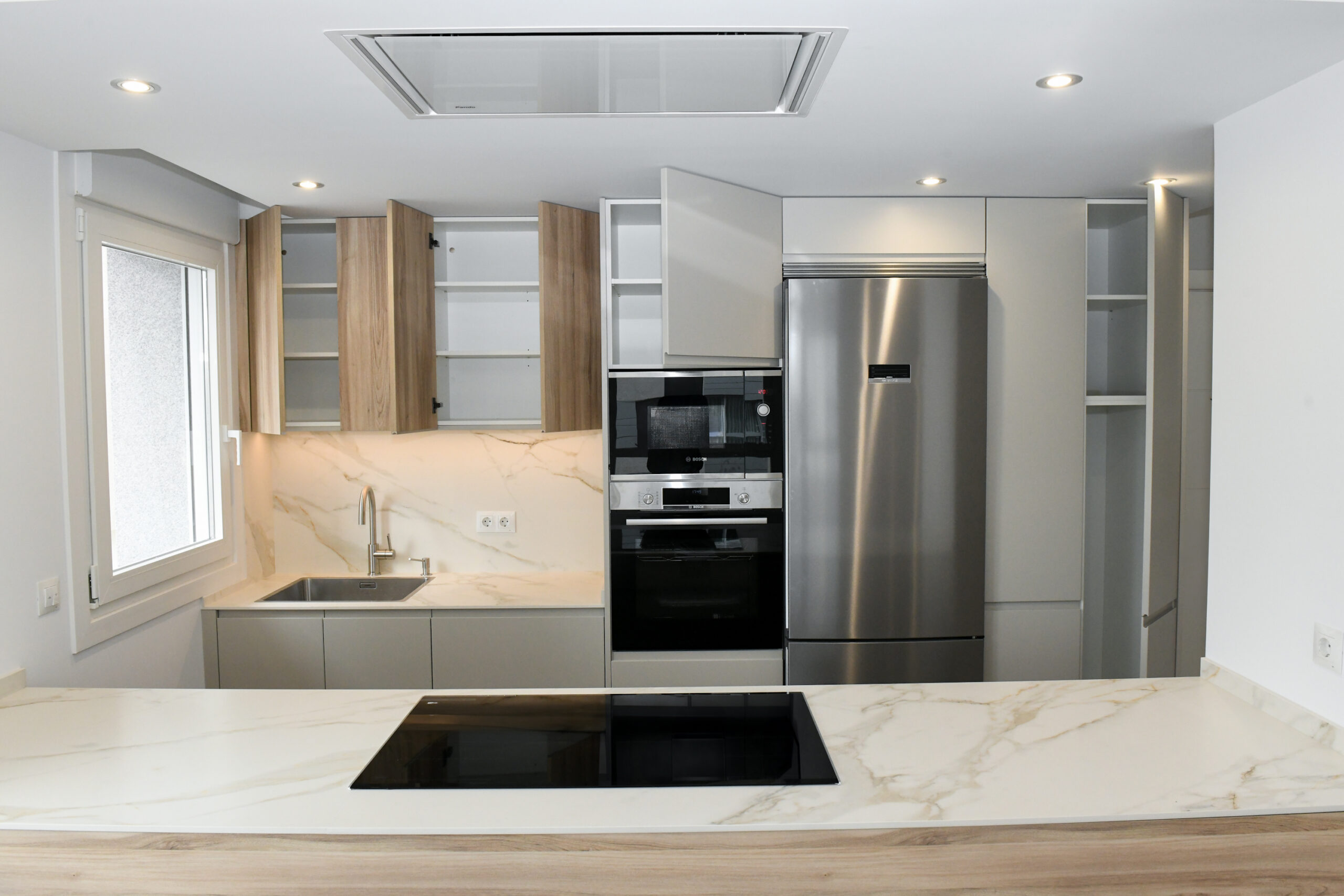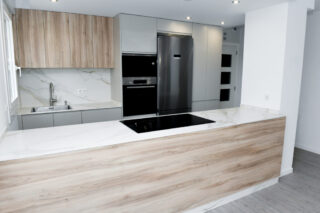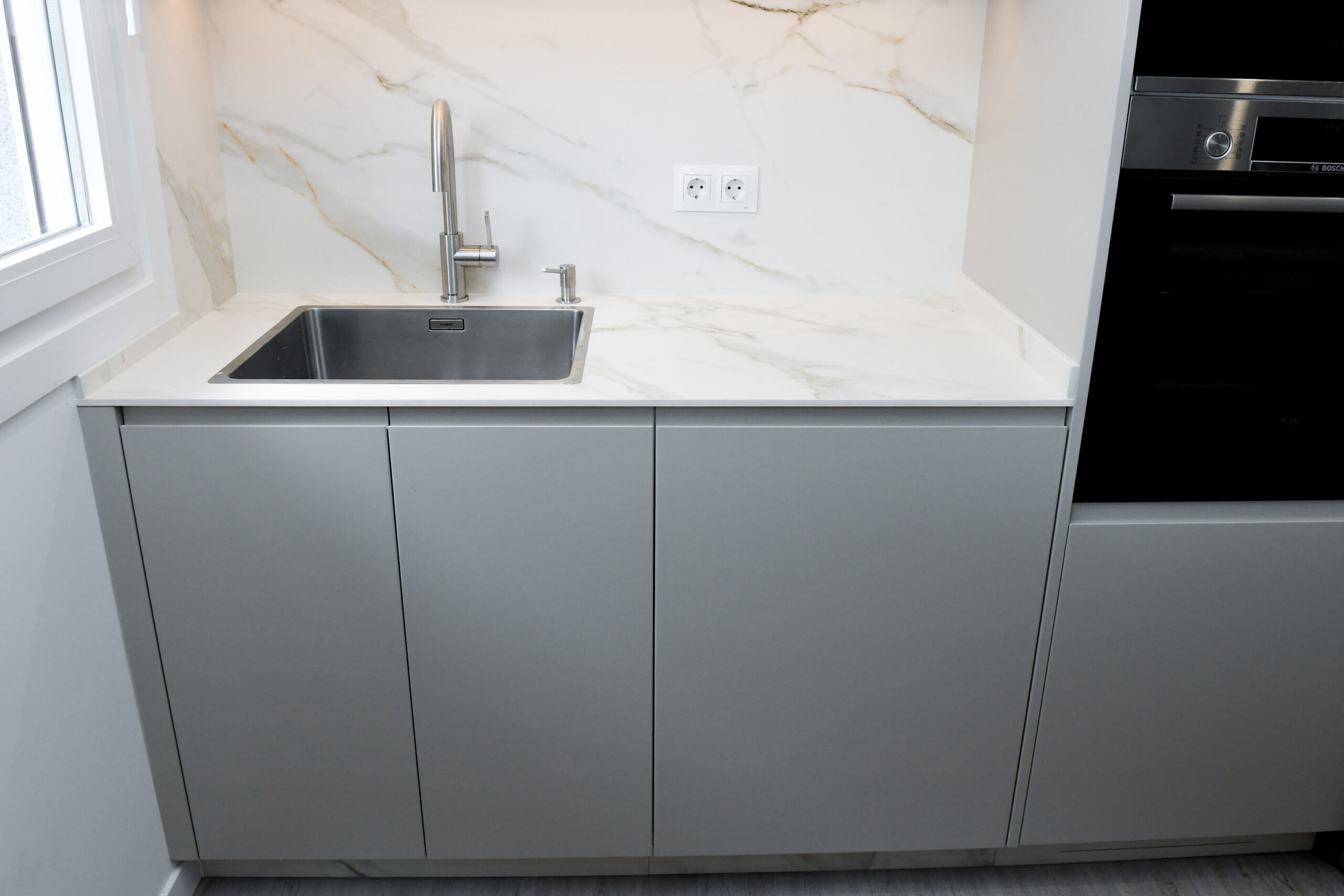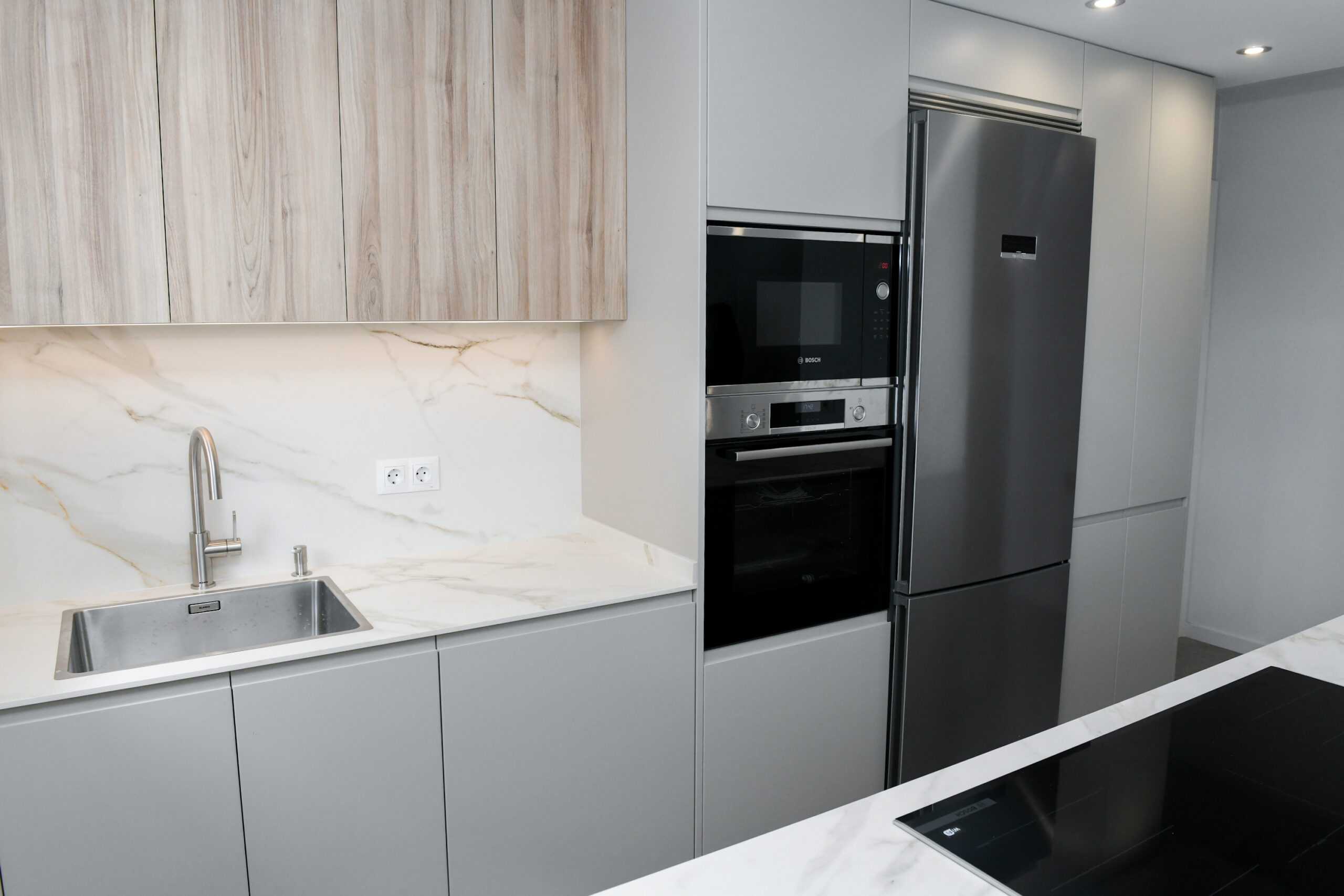 Encimera, trasera y zócalo en porcelánico Neolith Calacatta Roma 1,2cm caracterizada por la combinación de las vetas ocre y gris sobre el fondo blanco.