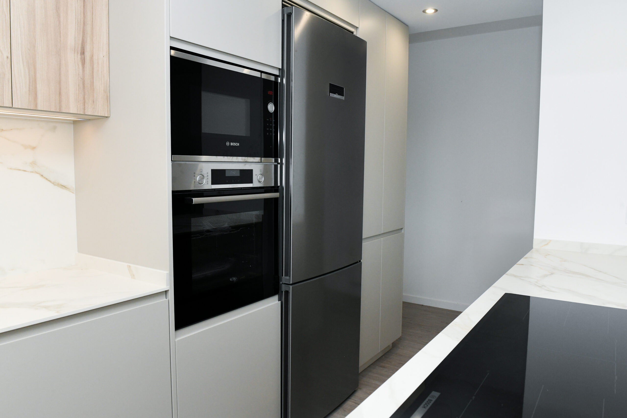 Muebles con puertas lacadas en color crema con uñero en el mismo color, combinada con puertas laminadas en acabado madera en los muebles altos.