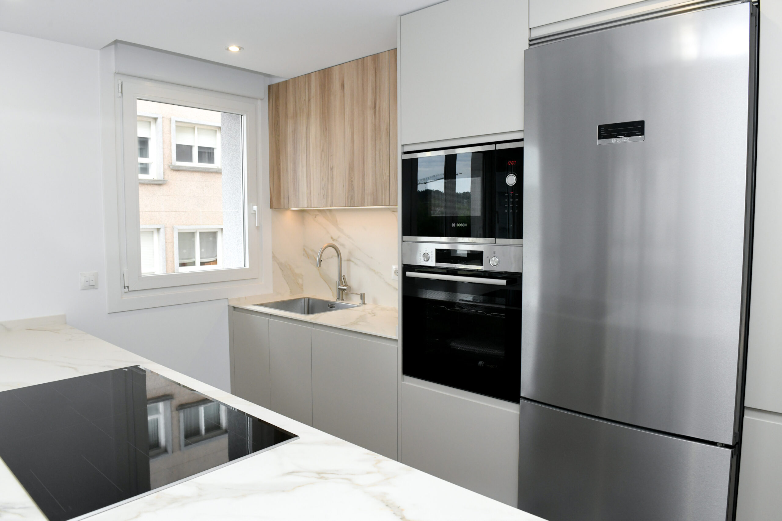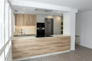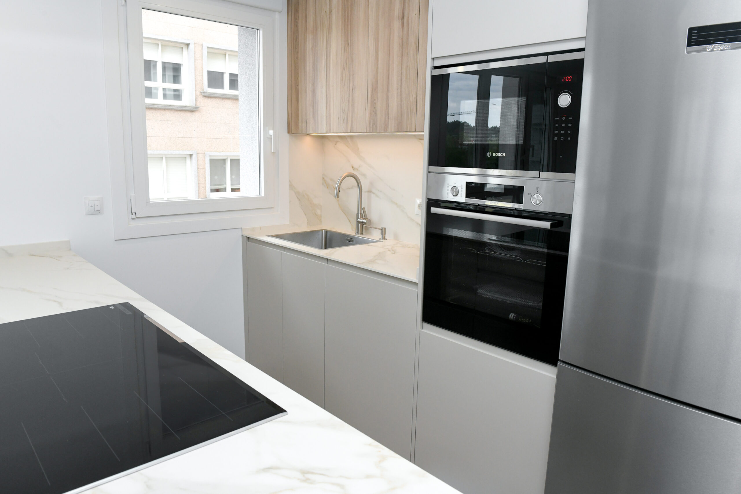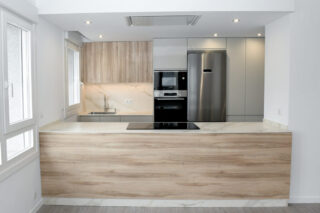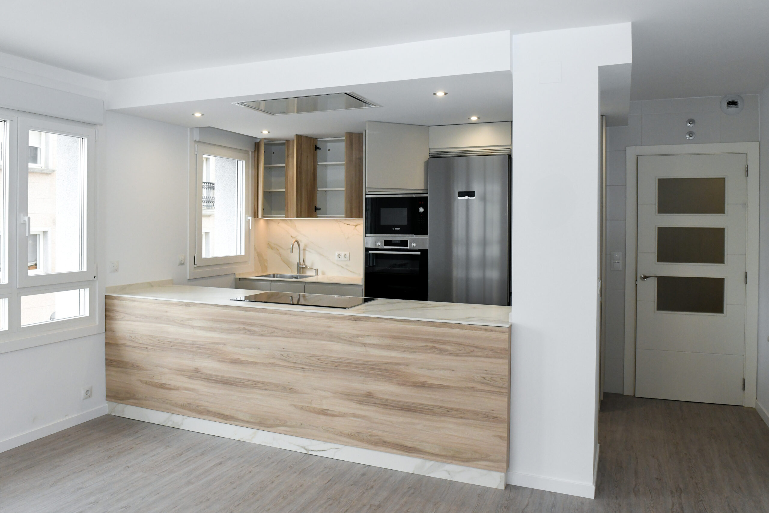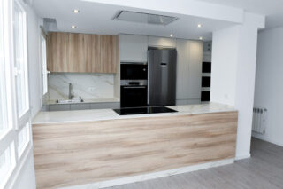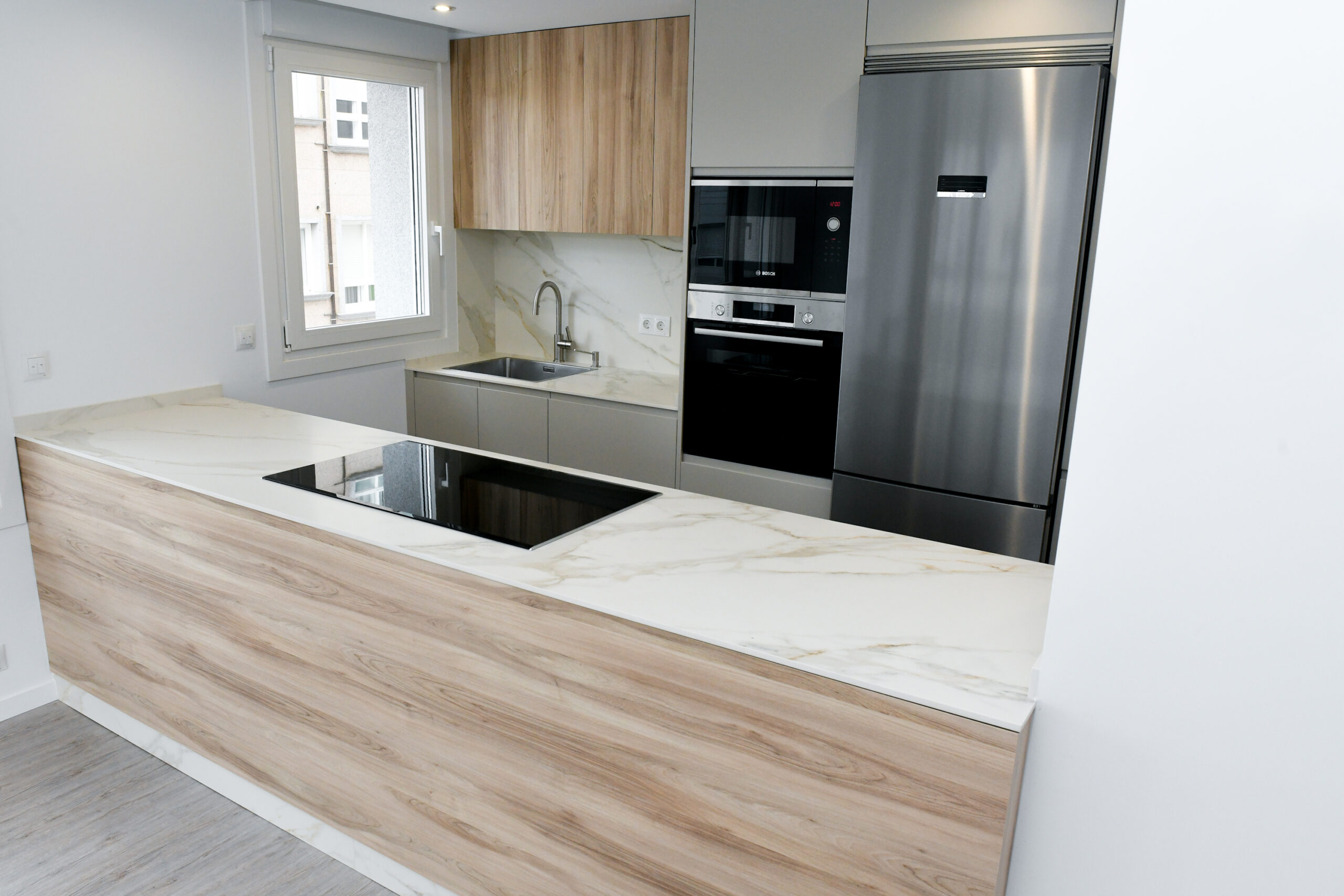 Una cocina donde la calidez de la madera y la elegancia de la encimera crean un espacio luminoso, práctico y lleno de vida.