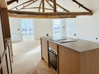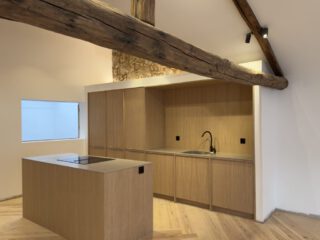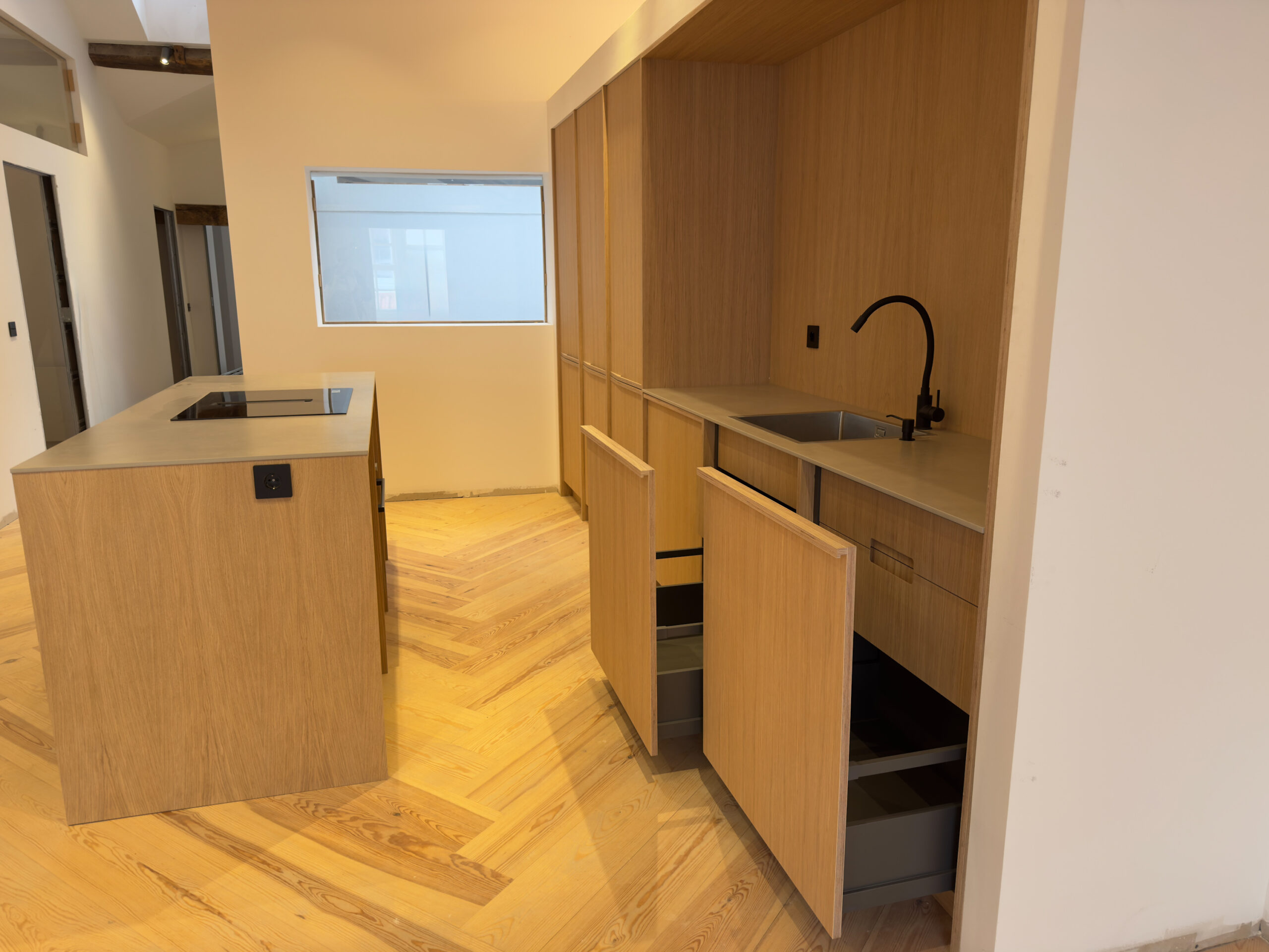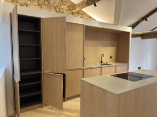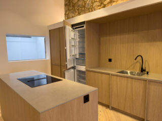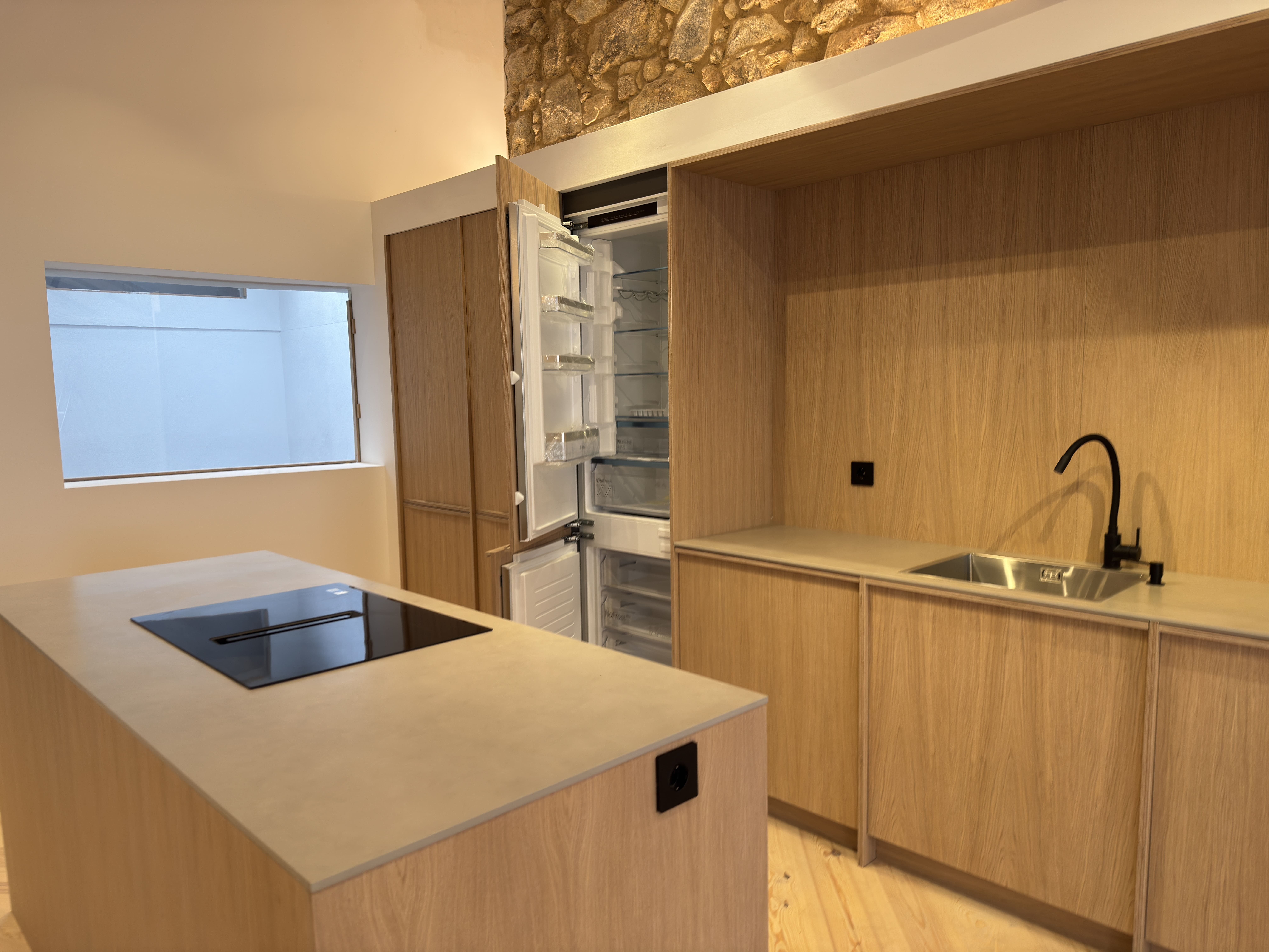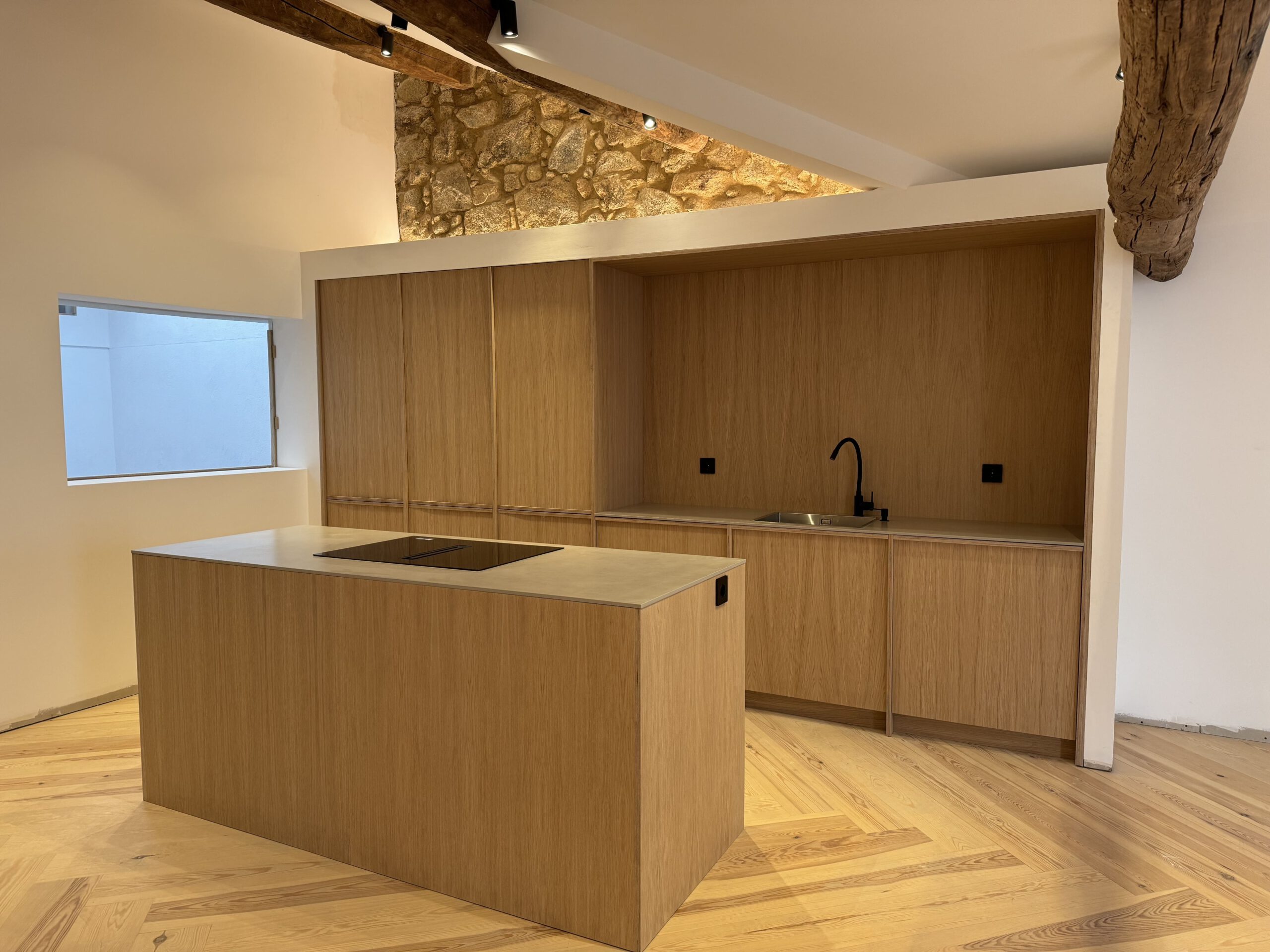 Instalación de cocina recta con una isla central donde está ubicada la placa de inducción con extractor integrado.