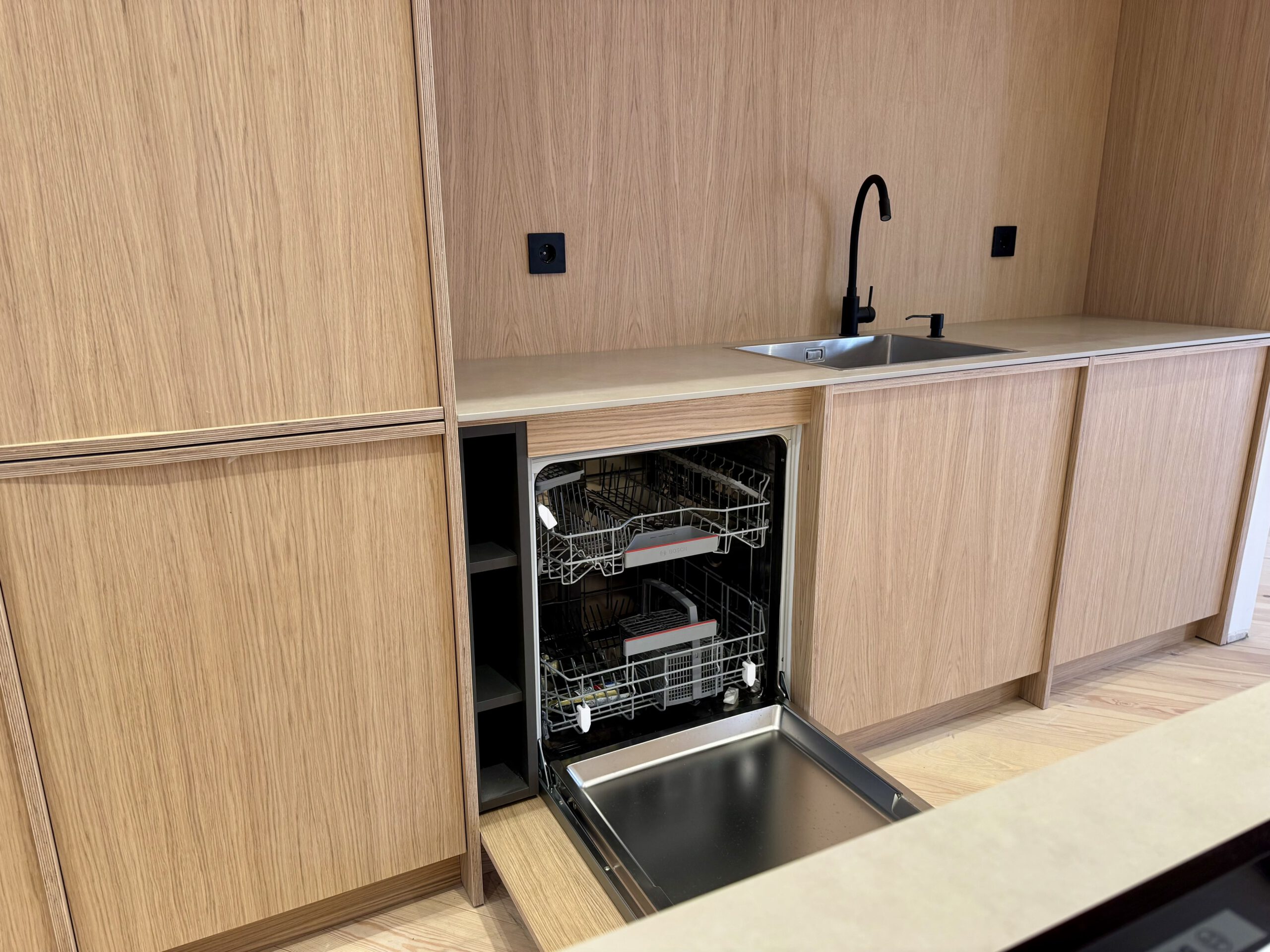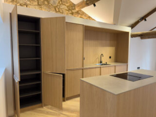 Cocina con puertas en tablero marino color roble con tirador integrado en la propia puerta.