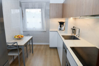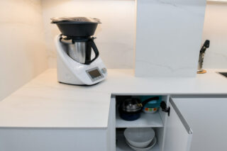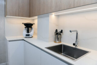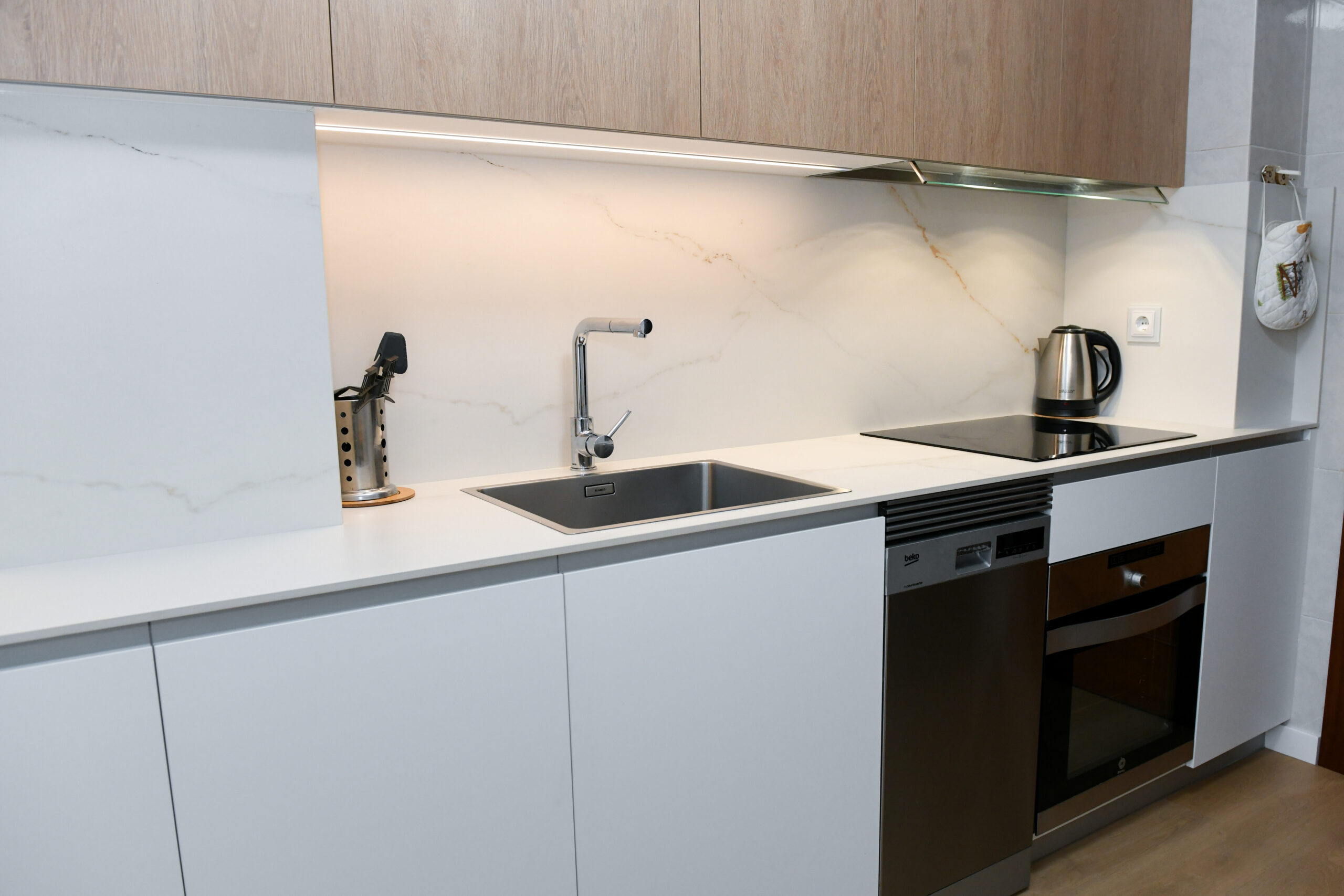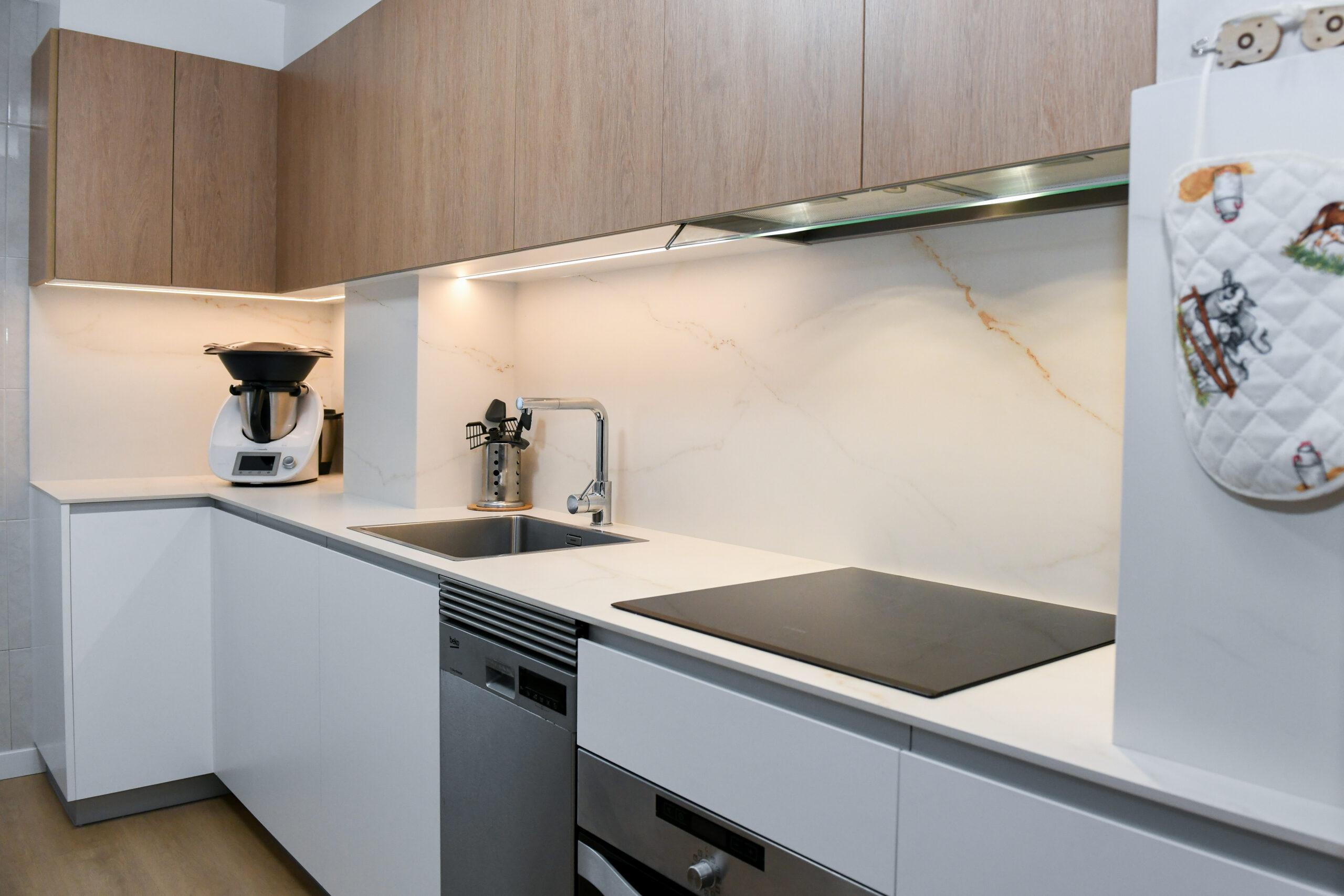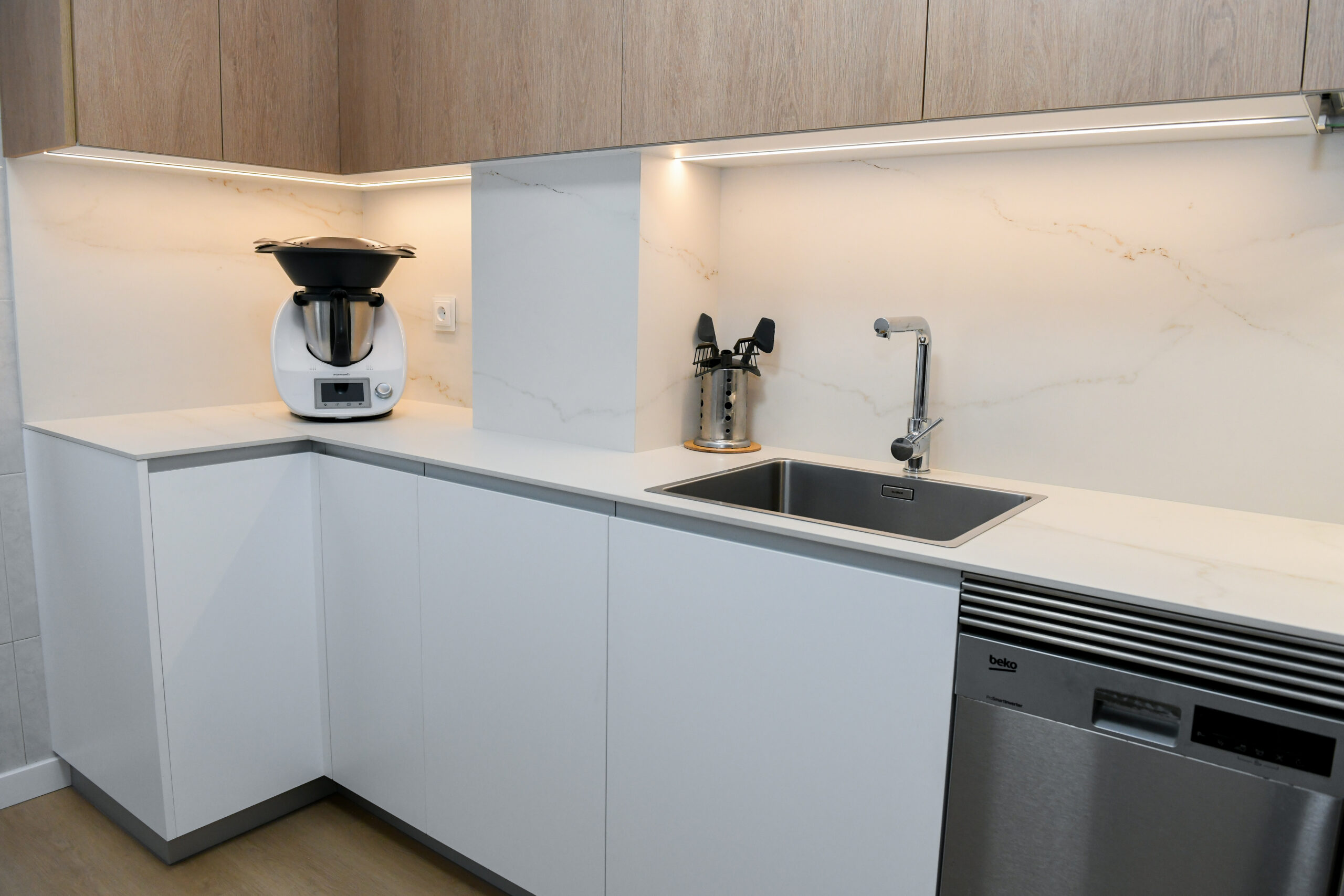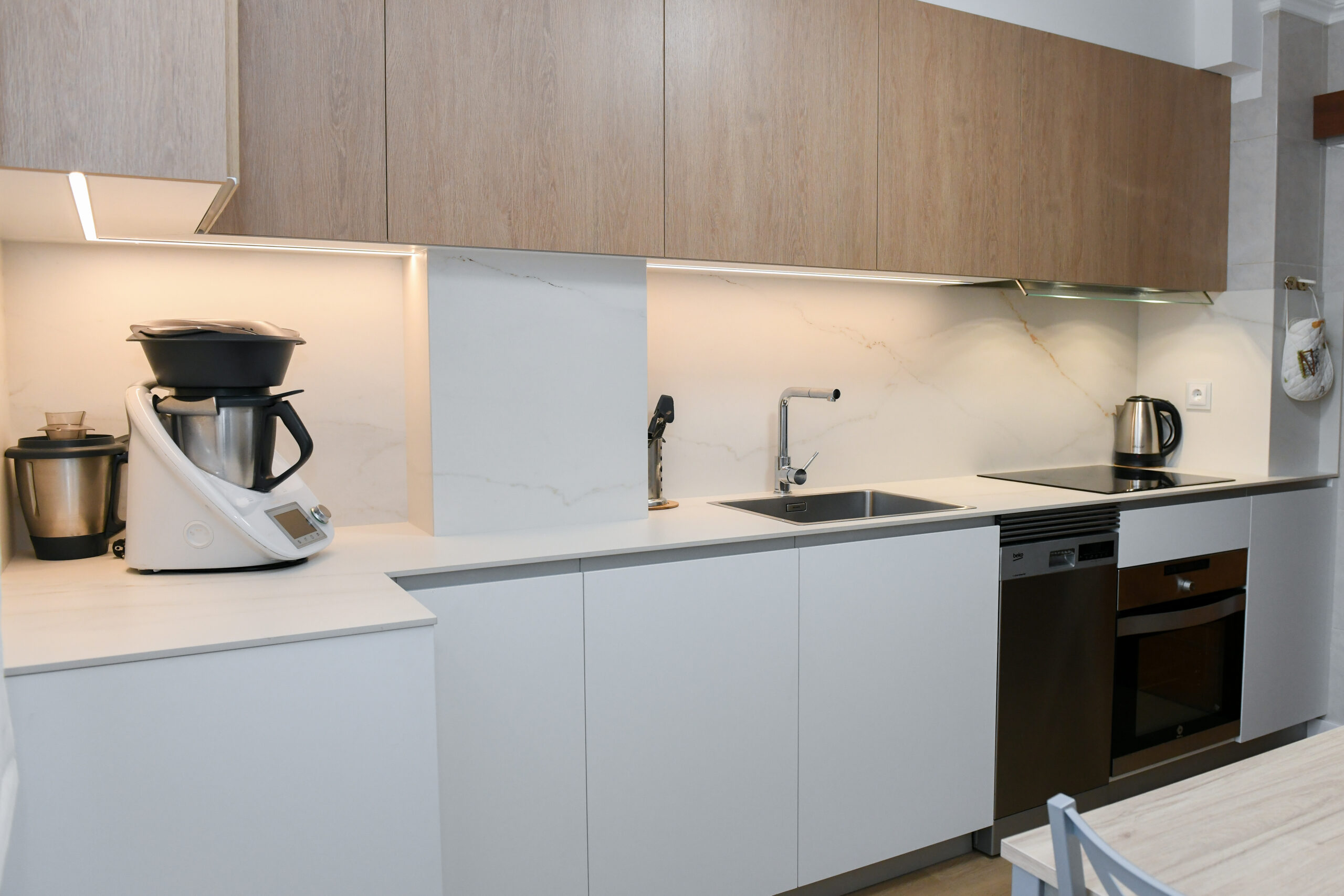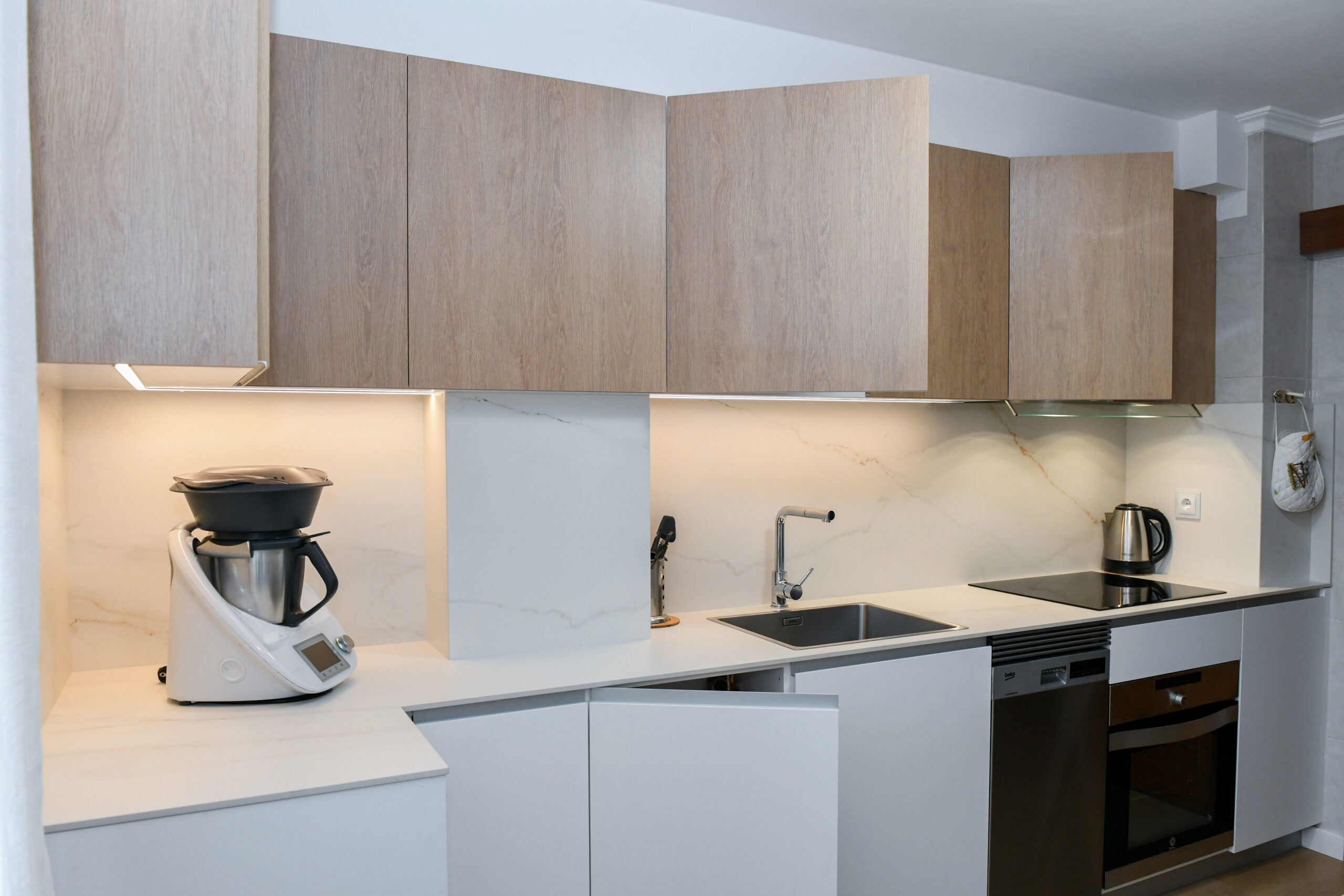 Iluminación led con intensidad regulable, bajo muebles altos.