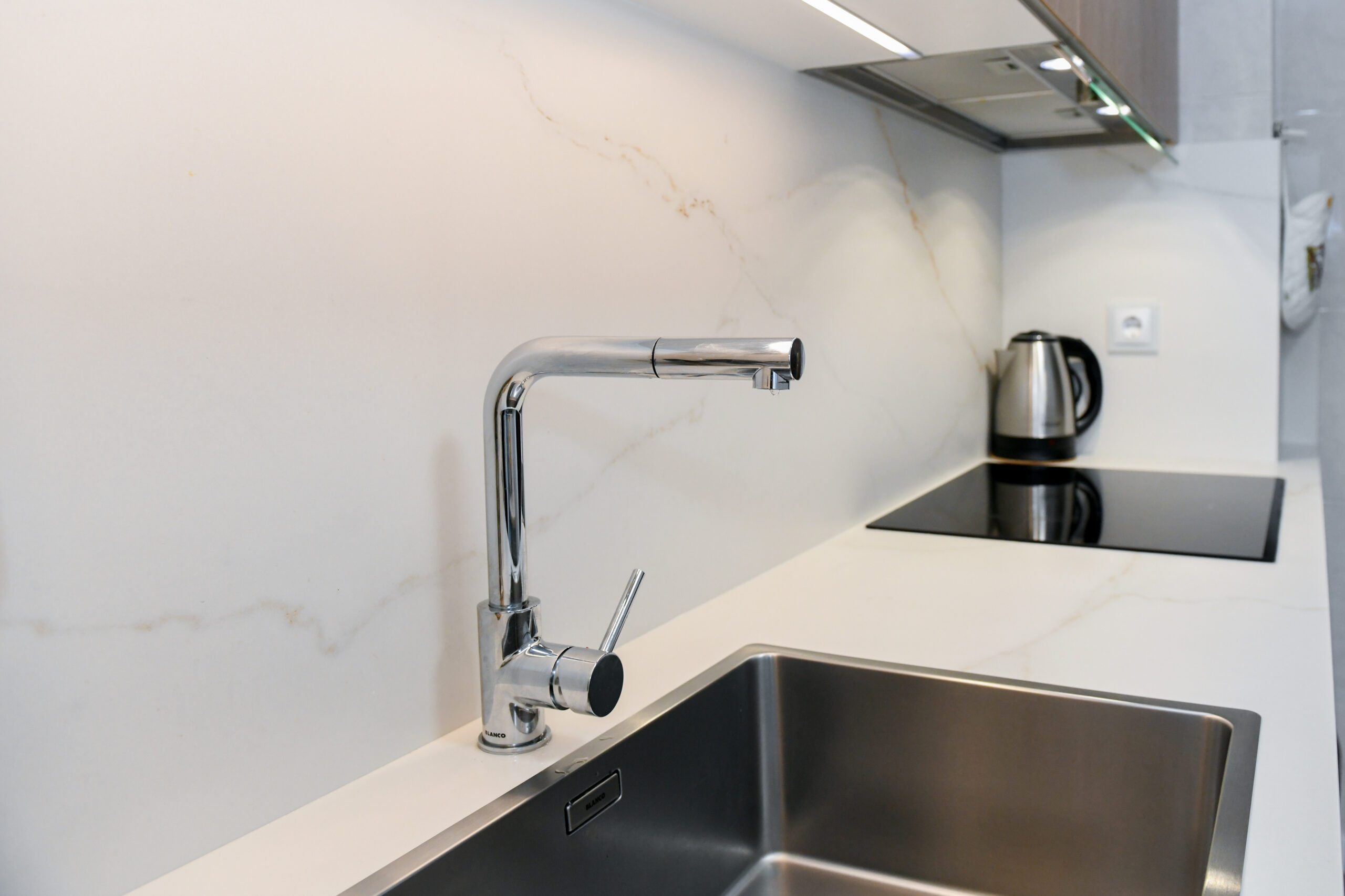 Fregadero de acero inoxidable instalado sobre encimera con grifo extraíble.